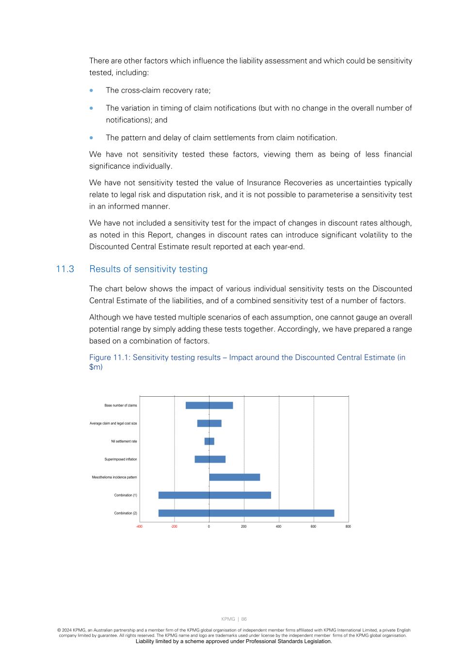 KPMG | 86 © 2024 KPMG, an Australian partnership and a member firm of the KPMG global organisation of independent member firms affiliated with KPMG International Limited, a private English company limited by guarantee. All rights reserved. The KPMG name and logo are trademarks used under license by the independent member firms of the KPMG global organisation. Liability limited by a scheme approved under Professional Standards Legislation. There are other factors which influence the liability assessment and which could be sensitivity tested, including: • The cross-claim recovery rate; • The variation in timing of claim notifications (but with no change in the overall number of notifications); and • The pattern and delay of claim settlements from claim notification. We have not sensitivity tested these factors, viewing them as being of less financial significance individually. We have not sensitivity tested the value of Insurance Recoveries as uncertainties typically relate to legal risk and disputation risk, and it is not possible to parameterise a sensitivity test in an informed manner. We have not included a sensitivity test for the impact of changes in discount rates although, as noted in this Report, changes in discount rates can introduce significant volatility to the Discounted Central Estimate result reported at each year-end. 11.3 Results of sensitivity testing The chart below shows the impact of various individual sensitivity tests on the Discounted Central Estimate of the liabilities, and of a combined sensitivity test of a number of factors. Although we have tested multiple scenarios of each assumption, one cannot gauge an overall potential range by simply adding these tests together. Accordingly, we have prepared a range based on a combination of factors. Figure 11.1: Sensitivity testing results – Impact around the Discounted Central Estimate (in $m) -400 -200 0 200 400 600 800 Base number of claims Average claim and legal cost size Nil settlement rate Superimposed inflation Mesothelioma incidence pattern Combination (1) Combination (2)