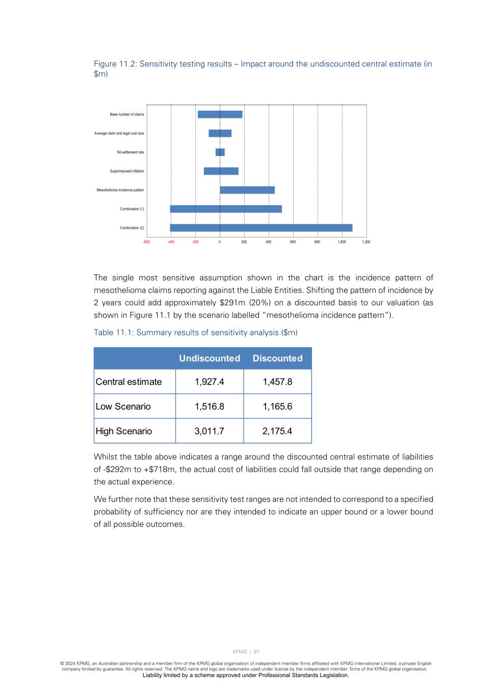KPMG | 87 © 2024 KPMG, an Australian partnership and a member firm of the KPMG global organisation of independent member firms affiliated with KPMG International Limited, a private English company limited by guarantee. All rights reserved. The KPMG name and logo are trademarks used under license by the independent member firms of the KPMG global organisation. Liability limited by a scheme approved under Professional Standards Legislation. Figure 11.2: Sensitivity testing results – Impact around the undiscounted central estimate (in $m) The single most sensitive assumption shown in the chart is the incidence pattern of mesothelioma claims reporting against the Liable Entities. Shifting the pattern of incidence by 2 years could add approximately $291m (20%) on a discounted basis to our valuation (as shown in Figure 11.1 by the scenario labelled “mesothelioma incidence pattern”). Table 11.1: Summary results of sensitivity analysis ($m) Whilst the table above indicates a range around the discounted central estimate of liabilities of -$292m to +$718m, the actual cost of liabilities could fall outside that range depending on the actual experience. We further note that these sensitivity test ranges are not intended to correspond to a specified probability of sufficiency nor are they intended to indicate an upper bound or a lower bound of all possible outcomes. -600 -400 -200 0 200 400 600 800 1,000 1,200 Base number of claims Average claim and legal cost size Nil settlement rate Superimposed inflation Mesothelioma incidence pattern Combination (1) Combination (2) Undiscounted Discounted Central estimate 1,927.4 1,457.8 Low Scenario 1,516.8 1,165.6 High Scenario 3,011.7 2,175.4