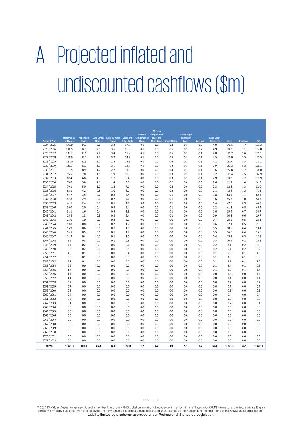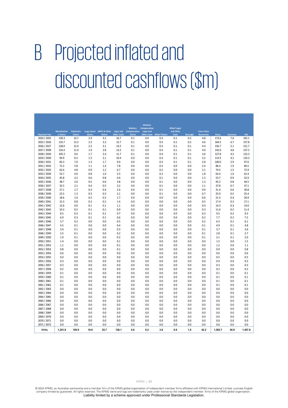 KPMG | 88 © 2024 KPMG, an Australian partnership and a member firm of the KPMG global organisation of independent member firms affiliated with KPMG International Limited, a private English company limited by guarantee. All rights reserved. The KPMG name and logo are trademarks used under license by the independent member firms of the KPMG global organisation. Liability limited by a scheme approved under Professional Standards Legislation. A Projected inflated and undiscounted cashflows ($m) Payment Year Mesotheliom a Claims Asbestosis Claims Lung Cancer Claims ARPD & Other Claims Legal and Other Costs Workers Compensation Claims Workers Compensation Legal and Other Costs Wharf Claims Wharf Legal and Other Costs Baryulgil Cross Claim Recoveries Gross Insurance Net 2024 / 2025 142.0 14.9 3.0 3.2 17.0 0.1 0.0 0.3 0.1 0.2 4.9 176.1 7.7 168.3 2025 / 2026 141.5 14.0 2.5 3.5 16.6 0.1 0.0 0.5 0.1 0.2 4.9 174.1 7.1 167.0 2026 / 2027 140.2 13.6 2.4 3.4 15.9 0.1 0.0 0.5 0.1 0.1 4.8 171.7 5.6 166.1 2027 / 2028 131.9 12.5 2.2 3.2 14.9 0.1 0.0 0.5 0.1 0.1 4.5 161.0 5.5 155.5 2028 / 2029 124.0 11.3 2.0 2.8 13.8 0.1 0.0 0.4 0.1 0.1 4.2 150.4 5.3 145.1 2029 / 2030 116.3 10.2 1.9 2.5 12.7 0.1 0.0 0.4 0.1 0.1 3.9 140.2 5.2 135.1 2030 / 2031 106.5 8.9 1.7 2.2 11.5 0.0 0.0 0.4 0.1 0.1 3.6 127.8 3.7 124.0 2031 / 2032 96.5 7.8 1.5 1.9 10.5 0.0 0.0 0.3 0.1 0.1 3.2 115.4 2.5 112.9 2032 / 2033 87.4 6.8 1.3 1.7 9.4 0.0 0.0 0.3 0.1 0.1 2.9 104.1 2.2 101.9 2033 / 2034 78.6 5.8 1.1 1.4 8.0 0.0 0.0 0.2 0.0 0.0 2.6 92.7 1.4 91.3 2034 / 2035 70.1 5.0 1.0 1.2 7.1 0.0 0.0 0.2 0.0 0.0 2.3 82.3 1.3 81.0 2035 / 2036 62.1 4.2 0.8 1.0 6.2 0.0 0.0 0.2 0.0 0.0 2.1 72.6 1.2 71.3 2036 / 2037 54.7 3.5 0.7 0.8 5.4 0.0 0.0 0.1 0.0 0.0 1.8 63.5 1.1 62.4 2037 / 2038 47.8 2.9 0.6 0.7 4.6 0.0 0.0 0.1 0.0 0.0 1.6 55.3 1.0 54.3 2038 / 2039 41.6 2.4 0.5 0.6 4.0 0.0 0.0 0.1 0.0 0.0 1.4 47.8 0.9 46.9 2039 / 2040 36.0 2.0 0.4 0.5 3.4 0.0 0.0 0.1 0.0 0.0 1.2 41.2 0.8 40.4 2040 / 2041 31.1 1.6 0.4 0.4 2.9 0.0 0.0 0.1 0.0 0.0 1.0 35.4 0.7 34.7 2041 / 2042 26.8 1.3 0.3 0.3 2.4 0.0 0.0 0.1 0.0 0.0 0.9 30.3 0.6 29.7 2042 / 2043 23.0 1.0 0.2 0.2 2.1 0.0 0.0 0.0 0.0 0.0 0.7 25.9 0.5 25.3 2043 / 2044 19.8 0.8 0.2 0.2 1.7 0.0 0.0 0.0 0.0 0.0 0.6 22.1 0.5 21.6 2044 / 2045 16.9 0.6 0.1 0.1 1.5 0.0 0.0 0.0 0.0 0.0 0.5 18.8 0.4 18.4 2045 / 2046 14.5 0.5 0.1 0.1 1.2 0.0 0.0 0.0 0.0 0.0 0.5 16.0 0.4 15.6 2046 / 2047 11.9 0.4 0.1 0.1 1.0 0.0 0.0 0.0 0.0 0.0 0.4 13.1 0.3 12.8 2047 / 2048 9.5 0.3 0.1 0.1 0.8 0.0 0.0 0.0 0.0 0.0 0.3 10.4 0.2 10.1 2048 / 2049 7.4 0.2 0.1 0.0 0.6 0.0 0.0 0.0 0.0 0.0 0.2 8.1 0.2 8.0 2049 / 2050 5.8 0.2 0.0 0.0 0.5 0.0 0.0 0.0 0.0 0.0 0.2 6.4 0.2 6.2 2050 / 2051 4.6 0.1 0.0 0.0 0.4 0.0 0.0 0.0 0.0 0.0 0.1 5.0 0.1 4.9 2051 / 2052 3.6 0.1 0.0 0.0 0.3 0.0 0.0 0.0 0.0 0.0 0.1 3.9 0.1 3.8 2052 / 2053 2.8 0.1 0.0 0.0 0.2 0.0 0.0 0.0 0.0 0.0 0.1 3.1 0.1 3.0 2053 / 2054 2.2 0.0 0.0 0.0 0.2 0.0 0.0 0.0 0.0 0.0 0.1 2.4 0.1 2.3 2054 / 2055 1.7 0.0 0.0 0.0 0.1 0.0 0.0 0.0 0.0 0.0 0.1 1.9 0.1 1.8 2055 / 2056 1.4 0.0 0.0 0.0 0.1 0.0 0.0 0.0 0.0 0.0 0.0 1.5 0.0 1.4 2056 / 2057 1.1 0.0 0.0 0.0 0.1 0.0 0.0 0.0 0.0 0.0 0.0 1.1 0.0 1.1 2057 / 2058 0.8 0.0 0.0 0.0 0.1 0.0 0.0 0.0 0.0 0.0 0.0 0.9 0.0 0.9 2058 / 2059 0.7 0.0 0.0 0.0 0.0 0.0 0.0 0.0 0.0 0.0 0.0 0.7 0.0 0.7 2059 / 2060 0.5 0.0 0.0 0.0 0.0 0.0 0.0 0.0 0.0 0.0 0.0 0.5 0.0 0.5 2060 / 2061 0.4 0.0 0.0 0.0 0.0 0.0 0.0 0.0 0.0 0.0 0.0 0.4 0.0 0.4 2061 / 2062 0.3 0.0 0.0 0.0 0.0 0.0 0.0 0.0 0.0 0.0 0.0 0.3 0.0 0.3 2062 / 2063 0.1 0.0 0.0 0.0 0.0 0.0 0.0 0.0 0.0 0.0 0.0 0.2 0.0 0.1 2063 / 2064 0.0 0.0 0.0 0.0 0.0 0.0 0.0 0.0 0.0 0.0 0.0 0.0 0.0 0.0 2064 / 2065 0.0 0.0 0.0 0.0 0.0 0.0 0.0 0.0 0.0 0.0 0.0 0.0 0.0 0.0 2065 / 2066 0.0 0.0 0.0 0.0 0.0 0.0 0.0 0.0 0.0 0.0 0.0 0.0 0.0 0.0 2066 / 2067 0.0 0.0 0.0 0.0 0.0 0.0 0.0 0.0 0.0 0.0 0.0 0.0 0.0 0.0 2067 / 2068 0.0 0.0 0.0 0.0 0.0 0.0 0.0 0.0 0.0 0.0 0.0 0.0 0.0 0.0 2068 / 2069 0.0 0.0 0.0 0.0 0.0 0.0 0.0 0.0 0.0 0.0 0.0 0.0 0.0 0.0 2069 / 2070 0.0 0.0 0.0 0.0 0.0 0.0 0.0 0.0 0.0 0.0 0.0 0.0 0.0 0.0 2070 / 2071 0.0 0.0 0.0 0.0 0.0 0.0 0.0 0.0 0.0 0.0 0.0 0.0 0.0 0.0 2071 / 2072 0.0 0.0 0.0 0.0 0.0 0.0 0.0 0.0 0.0 0.0 0.0 0.0 0.0 0.0 TOTAL 1,664.4 133.1 25.3 32.2 177.2 0.7 0.2 4.9 1.1 1.2 55.8 1,984.5 57.1 1,927.4