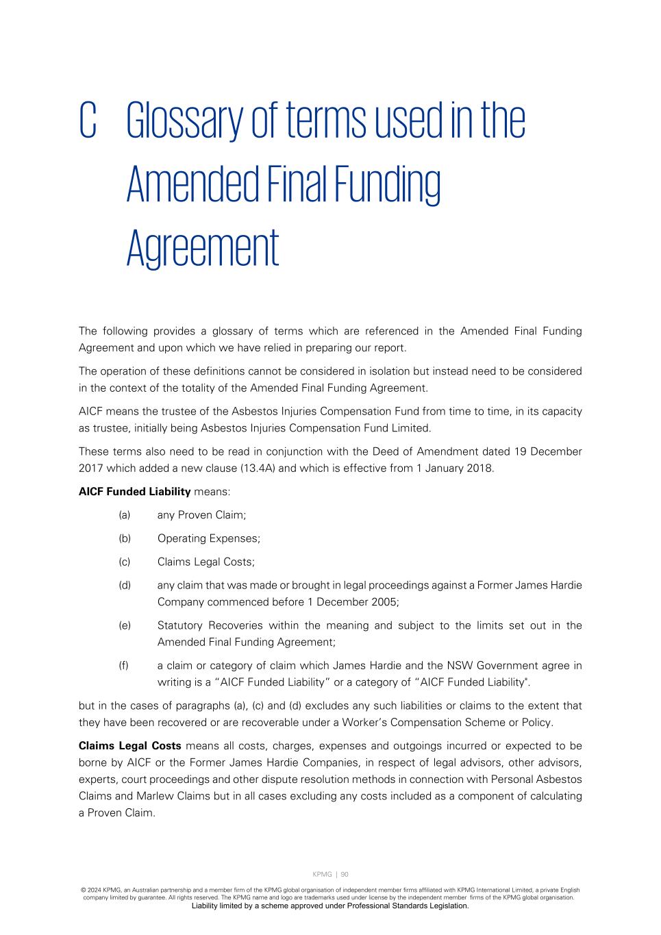 KPMG | 90 © 2024 KPMG, an Australian partnership and a member firm of the KPMG global organisation of independent member firms affiliated with KPMG International Limited, a private English company limited by guarantee. All rights reserved. The KPMG name and logo are trademarks used under license by the independent member firms of the KPMG global organisation. Liability limited by a scheme approved under Professional Standards Legislation. C Glossary of terms used in the Amended Final Funding Agreement The following provides a glossary of terms which are referenced in the Amended Final Funding Agreement and upon which we have relied in preparing our report. The operation of these definitions cannot be considered in isolation but instead need to be considered in the context of the totality of the Amended Final Funding Agreement. AICF means the trustee of the Asbestos Injuries Compensation Fund from time to time, in its capacity as trustee, initially being Asbestos Injuries Compensation Fund Limited. These terms also need to be read in conjunction with the Deed of Amendment dated 19 December 2017 which added a new clause (13.4A) and which is effective from 1 January 2018. AICF Funded Liability means: (a) any Proven Claim; (b) Operating Expenses; (c) Claims Legal Costs; (d) any claim that was made or brought in legal proceedings against a Former James Hardie Company commenced before 1 December 2005; (e) Statutory Recoveries within the meaning and subject to the limits set out in the Amended Final Funding Agreement; (f) a claim or category of claim which James Hardie and the NSW Government agree in writing is a “AICF Funded Liability” or a category of “AICF Funded Liability". but in the cases of paragraphs (a), (c) and (d) excludes any such liabilities or claims to the extent that they have been recovered or are recoverable under a Worker’s Compensation Scheme or Policy. Claims Legal Costs means all costs, charges, expenses and outgoings incurred or expected to be borne by AICF or the Former James Hardie Companies, in respect of legal advisors, other advisors, experts, court proceedings and other dispute resolution methods in connection with Personal Asbestos Claims and Marlew Claims but in all cases excluding any costs included as a component of calculating a Proven Claim.