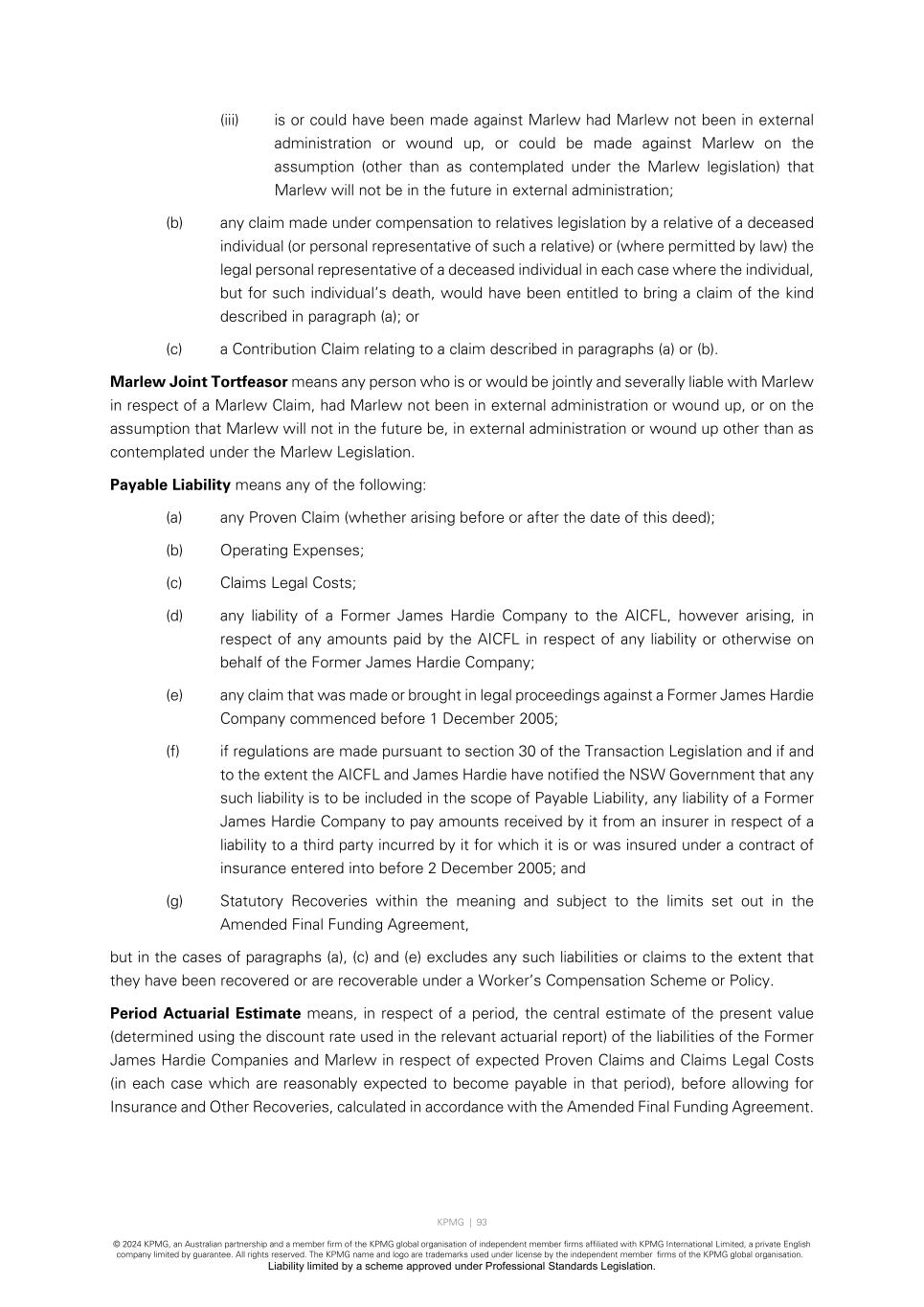 KPMG | 93 © 2024 KPMG, an Australian partnership and a member firm of the KPMG global organisation of independent member firms affiliated with KPMG International Limited, a private English company limited by guarantee. All rights reserved. The KPMG name and logo are trademarks used under license by the independent member firms of the KPMG global organisation. Liability limited by a scheme approved under Professional Standards Legislation. (iii) is or could have been made against Marlew had Marlew not been in external administration or wound up, or could be made against Marlew on the assumption (other than as contemplated under the Marlew legislation) that Marlew will not be in the future in external administration; (b) any claim made under compensation to relatives legislation by a relative of a deceased individual (or personal representative of such a relative) or (where permitted by law) the legal personal representative of a deceased individual in each case where the individual, but for such individual’s death, would have been entitled to bring a claim of the kind described in paragraph (a); or (c) a Contribution Claim relating to a claim described in paragraphs (a) or (b). Marlew Joint Tortfeasor means any person who is or would be jointly and severally liable with Marlew in respect of a Marlew Claim, had Marlew not been in external administration or wound up, or on the assumption that Marlew will not in the future be, in external administration or wound up other than as contemplated under the Marlew Legislation. Payable Liability means any of the following: (a) any Proven Claim (whether arising before or after the date of this deed); (b) Operating Expenses; (c) Claims Legal Costs; (d) any liability of a Former James Hardie Company to the AICFL, however arising, in respect of any amounts paid by the AICFL in respect of any liability or otherwise on behalf of the Former James Hardie Company; (e) any claim that was made or brought in legal proceedings against a Former James Hardie Company commenced before 1 December 2005; (f) if regulations are made pursuant to section 30 of the Transaction Legislation and if and to the extent the AICFL and James Hardie have notified the NSW Government that any such liability is to be included in the scope of Payable Liability, any liability of a Former James Hardie Company to pay amounts received by it from an insurer in respect of a liability to a third party incurred by it for which it is or was insured under a contract of insurance entered into before 2 December 2005; and (g) Statutory Recoveries within the meaning and subject to the limits set out in the Amended Final Funding Agreement, but in the cases of paragraphs (a), (c) and (e) excludes any such liabilities or claims to the extent that they have been recovered or are recoverable under a Worker’s Compensation Scheme or Policy. Period Actuarial Estimate means, in respect of a period, the central estimate of the present value (determined using the discount rate used in the relevant actuarial report) of the liabilities of the Former James Hardie Companies and Marlew in respect of expected Proven Claims and Claims Legal Costs (in each case which are reasonably expected to become payable in that period), before allowing for Insurance and Other Recoveries, calculated in accordance with the Amended Final Funding Agreement.