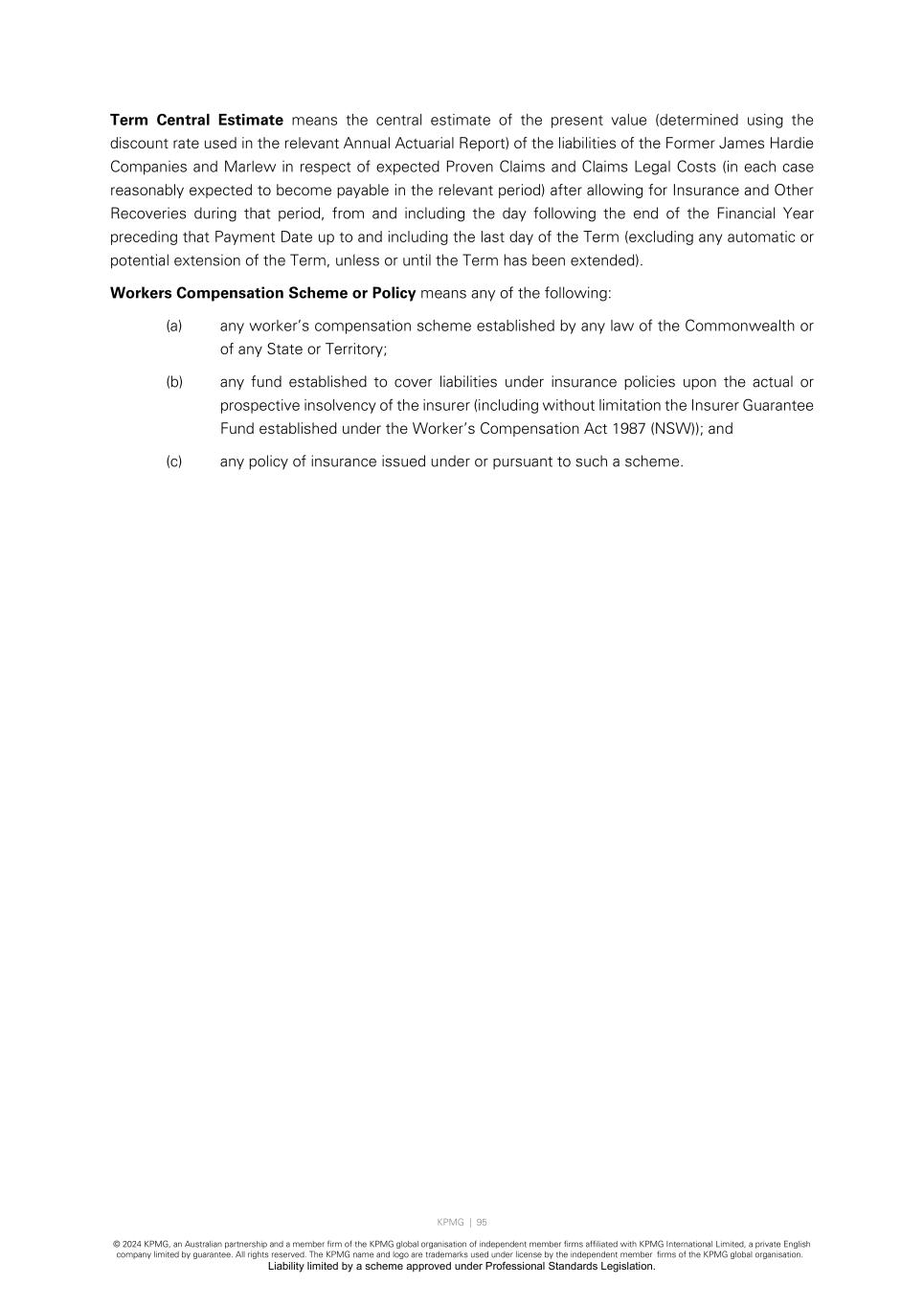 KPMG | 95 © 2024 KPMG, an Australian partnership and a member firm of the KPMG global organisation of independent member firms affiliated with KPMG International Limited, a private English company limited by guarantee. All rights reserved. The KPMG name and logo are trademarks used under license by the independent member firms of the KPMG global organisation. Liability limited by a scheme approved under Professional Standards Legislation. Term Central Estimate means the central estimate of the present value (determined using the discount rate used in the relevant Annual Actuarial Report) of the liabilities of the Former James Hardie Companies and Marlew in respect of expected Proven Claims and Claims Legal Costs (in each case reasonably expected to become payable in the relevant period) after allowing for Insurance and Other Recoveries during that period, from and including the day following the end of the Financial Year preceding that Payment Date up to and including the last day of the Term (excluding any automatic or potential extension of the Term, unless or until the Term has been extended). Workers Compensation Scheme or Policy means any of the following: (a) any worker’s compensation scheme established by any law of the Commonwealth or of any State or Territory; (b) any fund established to cover liabilities under insurance policies upon the actual or prospective insolvency of the insurer (including without limitation the Insurer Guarantee Fund established under the Worker’s Compensation Act 1987 (NSW)); and (c) any policy of insurance issued under or pursuant to such a scheme.