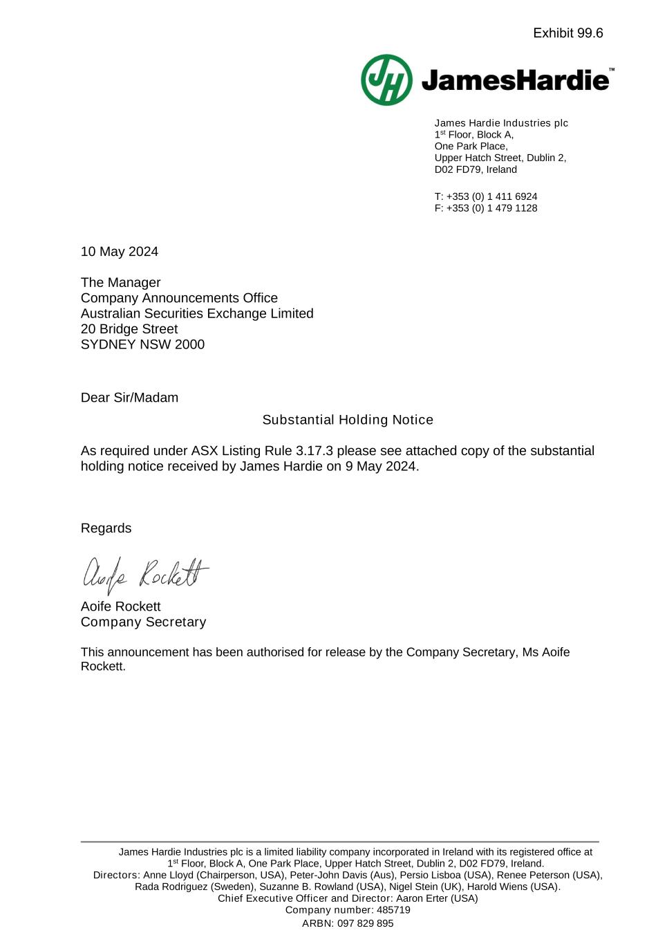 James Hardie Industries plc 1st Floor, Block A, One Park Place, Upper Hatch Street, Dublin 2, D02 FD79, Ireland T: +353 (0) 1 411 6924 F: +353 (0) 1 479 1128 James Hardie Industries plc is a limited liability company incorporated in Ireland with its registered office at 1st Floor, Block A, One Park Place, Upper Hatch Street, Dublin 2, D02 FD79, Ireland. Directors: Anne Lloyd (Chairperson, USA), Peter-John Davis (Aus), Persio Lisboa (USA), Renee Peterson (USA), Rada Rodriguez (Sweden), Suzanne B. Rowland (USA), Nigel Stein (UK), Harold Wiens (USA). Chief Executive Officer and Director: Aaron Erter (USA) Company number: 485719 ARBN: 097 829 895 10 May 2024 The Manager Company Announcements Office Australian Securities Exchange Limited 20 Bridge Street SYDNEY NSW 2000 Dear Sir/Madam Substantial Holding Notice As required under ASX Listing Rule 3.17.3 please see attached copy of the substantial holding notice received by James Hardie on 9 May 2024. Regards Aoife Rockett Company Secretary This announcement has been authorised for release by the Company Secretary, Ms Aoife Rockett. Exhibit 99.6