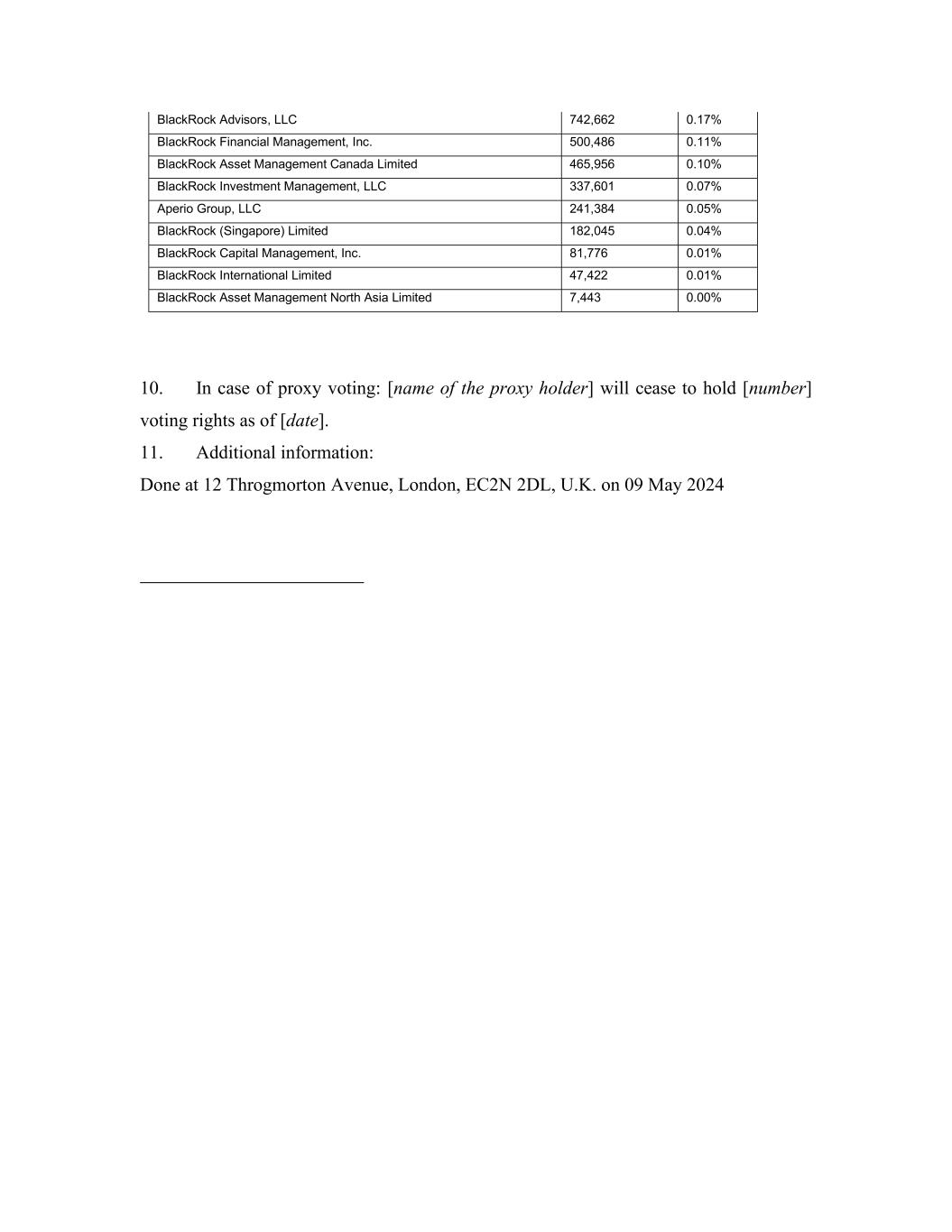 BlackRock Advisors, LLC 742,662 0.17% BlackRock Financial Management, Inc. 500,486 0.11% BlackRock Asset Management Canada Limited 465,956 0.10% BlackRock Investment Management, LLC 337,601 0.07% Aperio Group, LLC 241,384 0.05% BlackRock (Singapore) Limited 182,045 0.04% BlackRock Capital Management, Inc. 81,776 0.01% BlackRock International Limited 47,422 0.01% BlackRock Asset Management North Asia Limited 7,443 0.00% 10. In case of proxy voting: [name of the proxy holder] will cease to hold [number] voting rights as of [date]. 11. Additional information: Done at 12 Throgmorton Avenue, London, EC2N 2DL, U.K. on 09 May 2024