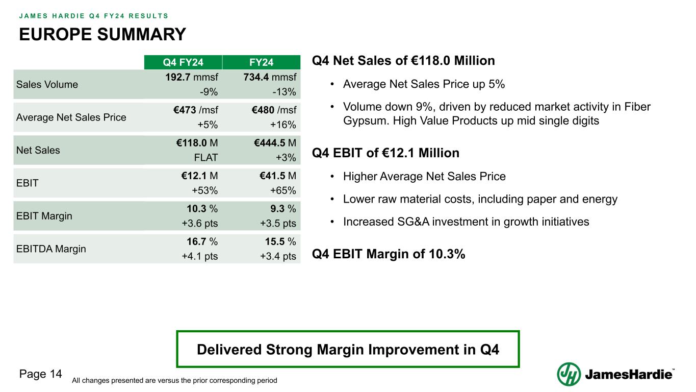 Page 13 J A M E S H A R D I E Q 4 F Y 2 4 R E S U L T S APAC SUMMARY Delivered Q4 Net Sales Growth of 5% Q4 Net Sales of A$215.2 Million • Average Net Sales Price up 9% • Volume down 4%; the best performing region was New Zealand which was up year over year Q4 EBIT of A$58.6 Million • Higher Average Net Sales Price • Higher cash costs due to product mix • Increased SG&A to support long-term demand creation Q4 EBIT Margin of 27.2% Q4 FY24 FY24 Sales Volume 139.7 mmsf 553.7 mmsf -4% -4% Average Net Sales Price A$1,380 /msf A$1,381 /msf +9% +12% Net Sales A$215.2 M A$856.3 M +5% +9% EBIT A$58.6 M A$252.7 M -1% +21% EBIT Margin 27.2 % 29.5 % -1.7 pts +3.0 pts EBITDA Margin 30.4 % 32.5 % -2.4 pts +3.3 pts All changes presented are versus the prior corresponding period
