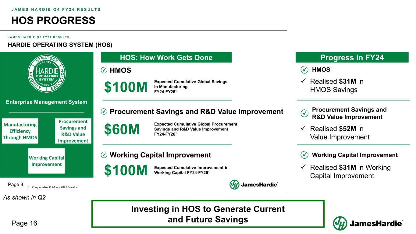 Page 16 J A M E S H A R D I E Q 4 F Y 2 4 R E S U L T S HOS PROGRESS Investing in HOS to Generate Current and Future Savings Page 8 J A M E S H A R D I E Q 2 F Y 2 4 R E S U L T S HARDIE OPERATING SYSTEM (HOS) Manufacturing Efficiency Through HMOS Working Capital Improvement Procurement Savings and R&D Value Improvement HOS: How Work Gets Done Procurement Savings and R&D Value Improvement Expected Cumulative Global Savings in Manufacturing FY24-FY261 $60M Expected Cumulative Global Procurement Savings and R&D Value Improvement FY24-FY261 HMOS Working Capital Improvement $100M Expected Cumulative Improvement in Working Capital FY24-FY261 $100M Enterprise Management System 1. Compared to 31 March 2023 Baseline  Realised $31M in HMOS Savings Progress in FY24 As shown in Q2 Procurement Savings and R&D Value Improvement HMOS  Realised $52M in Value Improvement Working Capital Improvement  Realised $31M in Working Capital Improvement