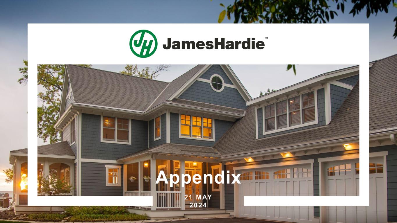 Page 2 J A M E S H A R D I E Q 4 F Y 2 4 R E S U L T S CAUTIONARY NOTE ON FORWARD-LOOKING STATEMENTS This Management Presentation contains forward looking statements within the meaning of the Private Securities Litigation Reform Act of 1995. James Hardie Industries plc (the “Company”) may from time to time make forward-looking statements in its periodic reports filed with or furnished to the Securities and Exchange Commission on Forms 20-F and 6-K, in its annual reports to shareholders, in media releases and other written materials and in oral statements made by the Company’s officers, directors or employees to analysts, institutional investors, representatives of the media and others. Words such as “believe,” “anticipate,” “plan,” “expect,” “intend,” “target,” “estimate,” “project,” “predict,” “forecast,” “guideline,” “aim,” “will,” “should,” “likely,” “continue,” “may,” “objective,” “outlook” and similar expressions are intended to identify forward-looking statements but are not the exclusive means of identifying such statements. These forward-looking statements are based upon management's current expectations, estimates, assumptions and beliefs concerning future events and conditions. Readers are cautioned not to place undue reliance on any forward-looking statements. Forward-looking statements are necessarily subject to risks, uncertainties and other factors, many of which are unforeseeable and beyond the Company’s control. Many factors could cause actual results, performance or achievements to be materially different from those expressed or implied in this Management Presentation, including, among others, the risks and uncertainties set forth in Section 3 “Risk Factors” in James Hardie’s Annual Report on Form 20-F for the year ended 31 March 2024; changes in general economic, political, governmental and business conditions globally and in the countries in which the Company does business, including; changes in interest rates; changes in inflation rates; changes in exchange rates; the level of construction generally; changes in cement demand and prices; changes in raw material and energy prices; changes in business strategy and various other factors. Should one or more of these risks or uncertainties materialize, or should underlying assumptions prove incorrect, actual results may vary materially from those described herein. James Hardie assumes no obligation to update or correct the information contained in this Management Presentation except as required by law. This Management Presentation includes financial measures that are not considered a measure of financial performance under generally accepted accounting principles in the United States (GAAP). These financial measures are designed to provide investors with an alternative method for assessing our performance from on-going operations, capital efficiency and profit generation. Management uses these financial measures for the same purposes. These financial measures are or may be non-GAAP financial measures as defined in the rules of the U.S. Securities and Exchange Commission and may exclude or include amounts that are included or excluded, as applicable, in the calculation of the most directly comparable financial measures calculated in accordance with GAAP. These non-GAAP financial measures should not be considered to be more meaningful than the equivalent GAAP measure. Management has included such measures to provide investors with an alternative method for assessing its operating results in a manner that is focused on the performance of its ongoing operations and excludes the impact of certain legacy items, such as asbestos adjustments. Additionally, management uses such non-GAAP financial measures for the same purposes. However, these non-GAAP financial measures are not prepared in accordance with GAAP, may not be reported by all of the Company’s competitors and may not be directly comparable to similarly titled measures of the Company’s competitors due to potential differences in the exact method of calculation. For additional information regarding the non-GAAP financial measures presented in this Management Presentation, including a reconciliation of each non-GAAP financial measure to the equivalent GAAP measure, see the slide titled “Non-GAAP Financial Measures” included in the Appendix to this Management Presentation. In addition, this Management Presentation includes financial measures and descriptions that are considered to not be in accordance with GAAP, but which are consistent with financial measures reported by Australian companies, such as operating profit, EBIT and EBIT margin. Since the Company prepares its Consolidated Financial Statements in accordance with GAAP, the Company provides investors with definitions and a cross- reference from the non-GAAP financial measure used in this Management Presentation to the equivalent GAAP financial measure used in the Company’s Consolidated Financial Statements. See the section titled “Non- GAAP Financial Measures” included in the Appendix to this Management Presentation. All amounts are in US Dollars, unless otherwise noted CAUTIONARY NOTE ON FORWARD-LOOKING STATEMENTS USE OF NON-GAAP FINANCIAL INFORMATION; AUSTRALIAN EQUIVALENT TERMINOLOGY