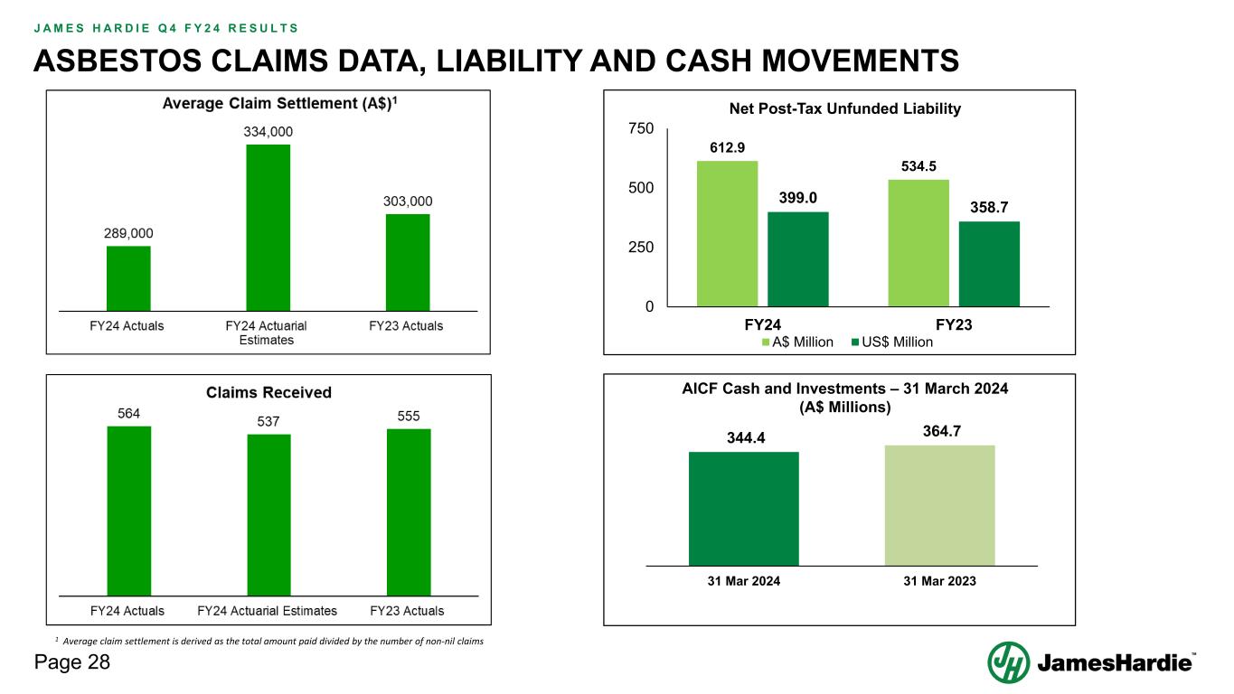 Page 28 J A M E S H A R D I E Q 4 F Y 2 4 R E S U L T S 1 Average claim settlement is derived as the total amount paid divided by the number of non-nil claims 612.9 534.5 399.0 358.7 0 250 500 750 FY24 FY23 A$ Million US$ Million Net Post-Tax Unfunded Liability 344.4 364.7 31 Mar 2024 31 Mar 2023 AICF Cash and Investments – 31 March 2024 (A$ Millions) ASBESTOS CLAIMS DATA, LIABILITY AND CASH MOVEMENTS