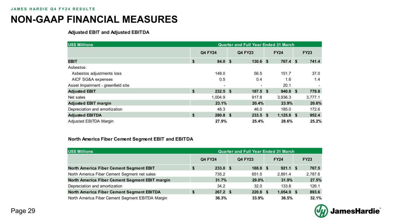 Page 29 J A M E S H A R D I E Q 4 F Y 2 4 R E S U L T S NON-GAAP FINANCIAL MEASURES Adjusted EBIT and Adjusted EBITDA US$ Millions Q4 FY24 Q4 FY23 FY24 FY23 EBIT 84.0$ 130.6$ 767.4$ 741.4$ Asbestos: Asbestos adjustments loss 148.0 56.5 151.7 37.0 AICF SG&A expenses 0.5 0.4 1.6 1.4 Asset Impairment - greenfield site - - 20.1 - Adjusted EBIT 232.5$ 187.5$ 940.8$ 779.8$ Net sales 1,004.9 917.8 3,936.3 3,777.1 Adjusted EBIT margin 23.1% 20.4% 23.9% 20.6% Depreciation and amortization 48.3 46.0 185.0 172.6 Adjusted EBITDA 280.8$ 233.5$ 1,125.8$ 952.4$ Adjusted EBITDA Margin 27.9% 25.4% 28.6% 25.2% Quarter and Full Year Ended 31 March US$ Millions Q4 FY24 Q4 FY23 FY24 FY23 North America Fiber Cement Segment EBIT 233.0$ 188.8$ 921.1$ 767.5$ North America Fiber Cement Segment net sales 735.2 651.5 2,891.4 2,787.6 North America Fiber Cement Segment EBIT margin 31.7% 29.0% 31.9% 27.5% Depreciation and amortization 34.2 32.0 133.8 126.1 North America Fiber Cement Segment EBITDA 267.2$ 220.8$ 1,054.9$ 893.6$ North America Fiber Cement Segment EBITDA Margin 36.3% 33.9% 36.5% 32.1% North America Fiber Cement Segment EBIT and EBITDA Quarter and Full Year Ended 31 March