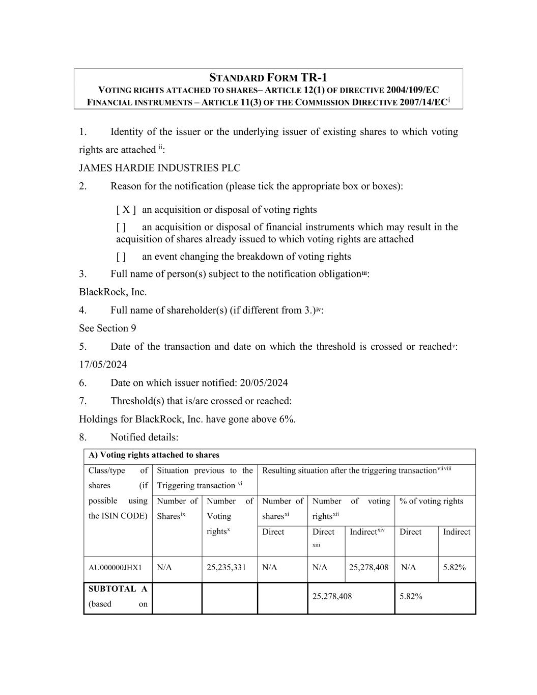 STANDARD FORM TR-1 VOTING RIGHTS ATTACHED TO SHARES– ARTICLE 12(1) OF DIRECTIVE 2004/109/EC FINANCIAL INSTRUMENTS – ARTICLE 11(3) OF THE COMMISSION DIRECTIVE 2007/14/ECi 1. Identity of the issuer or the underlying issuer of existing shares to which voting rights are attached ii: JAMES HARDIE INDUSTRIES PLC 2. Reason for the notification (please tick the appropriate box or boxes): [ X ] an acquisition or disposal of voting rights [ ] an acquisition or disposal of financial instruments which may result in the acquisition of shares already issued to which voting rights are attached [ ] an event changing the breakdown of voting rights 3. Full name of person(s) subject to the notification obligationiii: BlackRock, Inc. 4. Full name of shareholder(s) (if different from 3.) iv: See Section 9 5. Date of the transaction and date on which the threshold is crossed or reachedv: 17/05/2024 6. Date on which issuer notified: 20/05/2024 7. Threshold(s) that is/are crossed or reached: Holdings for BlackRock, Inc. have gone above 6%. 8. Notified details: A) Voting rights attached to shares Class/type of shares (if possible using the ISIN CODE) Situation previous to the Triggering transaction vi Resulting situation after the triggering transactionviiviii Number of Sharesix Number of Voting rightsx Number of sharesxi Number of voting rightsxii % of voting rights Direct Direct xiii Indirectxiv Direct Indirect AU000000JHX1 N/A 25,235,331 N/A N/A 25,278,408 N/A 5.82% SUBTOTAL A (based on 25,278,408 5.82%