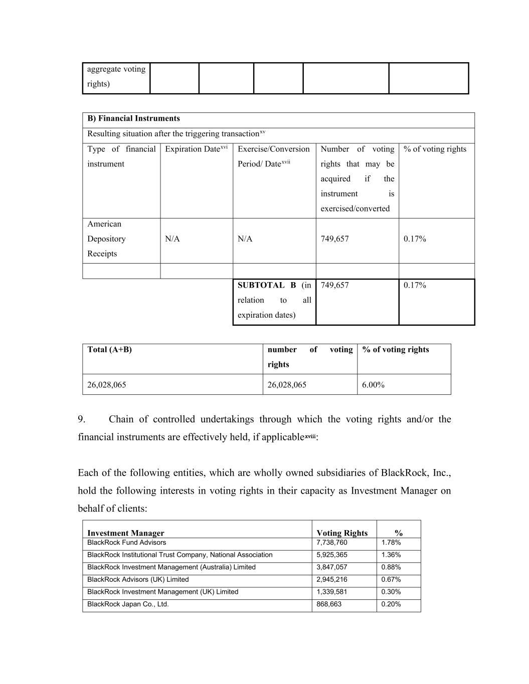 aggregate voting rights) B) Financial Instruments Resulting situation after the triggering transactionxv Type of financial instrument Expiration Datexvi Exercise/Conversion Period/ Datexvii Number of voting rights that may be acquired if the instrument is exercised/converted % of voting rights American Depository Receipts N/A N/A 749,657 0.17% SUBTOTAL B (in relation to all expiration dates) 749,657 0.17% Total (A+B) number of voting rights % of voting rights 26,028,065 26,028,065 6.00% 9. Chain of controlled undertakings through which the voting rights and/or the financial instruments are effectively held, if applicablexviii: Each of the following entities, which are wholly owned subsidiaries of BlackRock, Inc., hold the following interests in voting rights in their capacity as Investment Manager on behalf of clients: Investment Manager Voting Rights % BlackRock Fund Advisors 7,738,760 1.78% BlackRock Institutional Trust Company, National Association 5,925,365 1.36% BlackRock Investment Management (Australia) Limited 3,847,057 0.88% BlackRock Advisors (UK) Limited 2,945,216 0.67% BlackRock Investment Management (UK) Limited 1,339,581 0.30% BlackRock Japan Co., Ltd. 868,663 0.20%