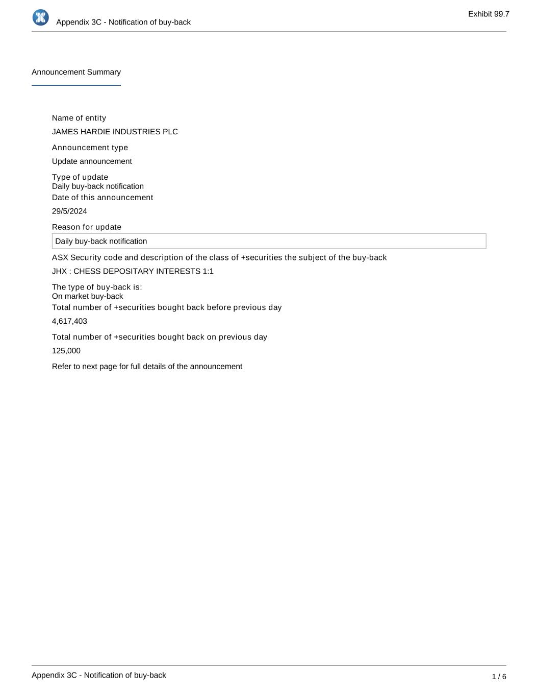 Appendix 3C - Notification of buy-back Appendix 3C - Notification of buy-back 1 / 6 Announcement Summary Name of entity JAMES HARDIE INDUSTRIES PLC Announcement type Update announcement Type of update Date of this announcement 29/5/2024 Reason for update Daily buy-back notification ASX Security code and description of the class of +securities the subject of the buy-back JHX : CHESS DEPOSITARY INTERESTS 1:1 The type of buy-back is: Total number of +securities bought back before previous day 4,617,403 Total number of +securities bought back on previous day 125,000 Refer to next page for full details of the announcement On market buy-back Daily buy-back notification Exhibit 99.7