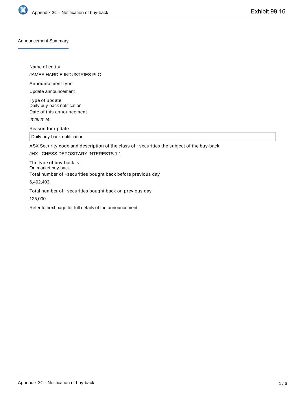 Appendix 3C - Notification of buy-back Appendix 3C - Notification of buy-back 1 / 6 Announcement Summary Name of entity JAMES HARDIE INDUSTRIES PLC Announcement type Update announcement Type of update Date of this announcement 20/6/2024 Reason for update Daily buy-back notification ASX Security code and description of the class of +securities the subject of the buy-back JHX : CHESS DEPOSITARY INTERESTS 1:1 The type of buy-back is: Total number of +securities bought back before previous day 6,492,403 Total number of +securities bought back on previous day 125,000 Refer to next page for full details of the announcement On market buy-back Daily buy-back notification Exhibit 99.16
