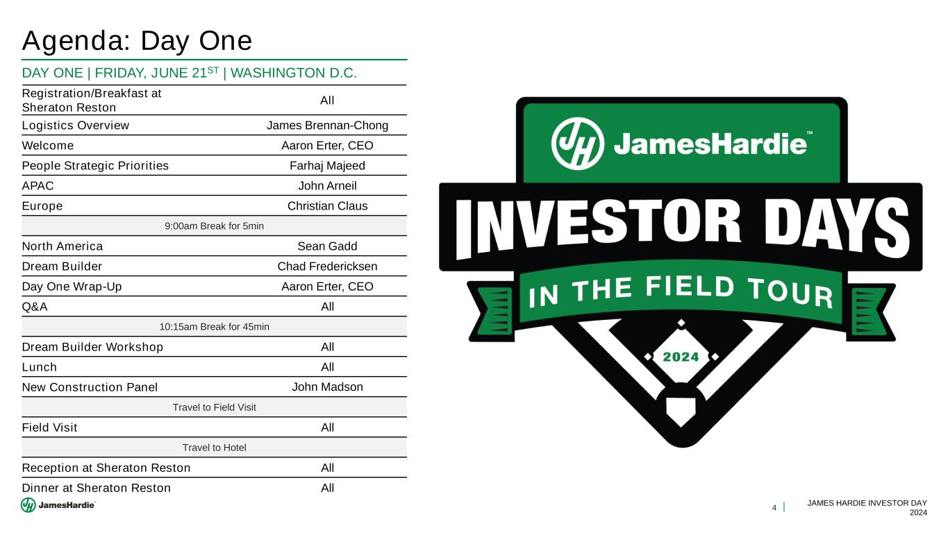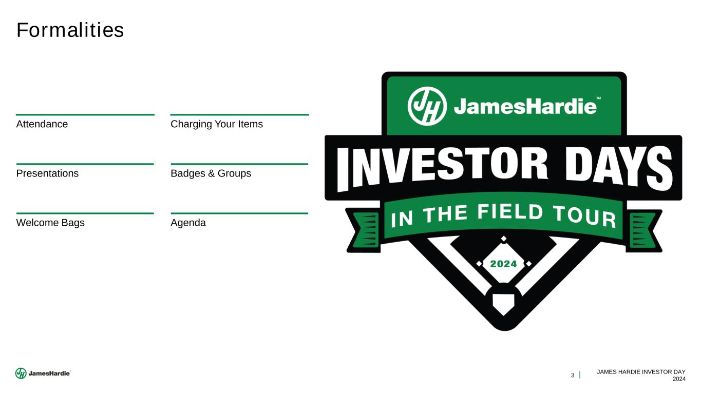 3 JAMES HARDIE INVESTOR DAY 2024 Formalities Attendance Presentations Welcome Bags Charging Your Items Badges & Groups Agenda