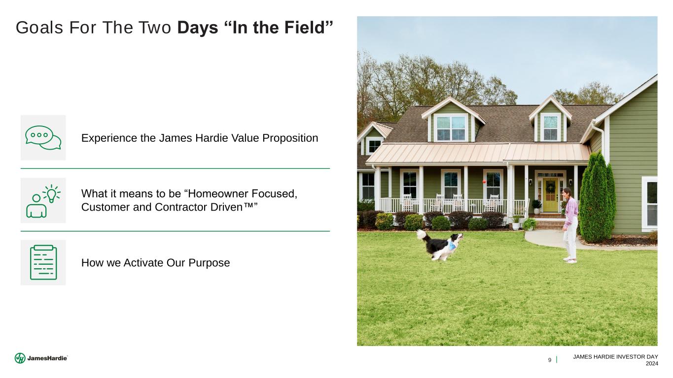 9 JAMES HARDIE INVESTOR DAY 2024 Goals For The Two Days “In the Field” Experience the James Hardie Value Proposition What it means to be “Homeowner Focused, Customer and Contractor Driven ” How we Activate Our Purpose