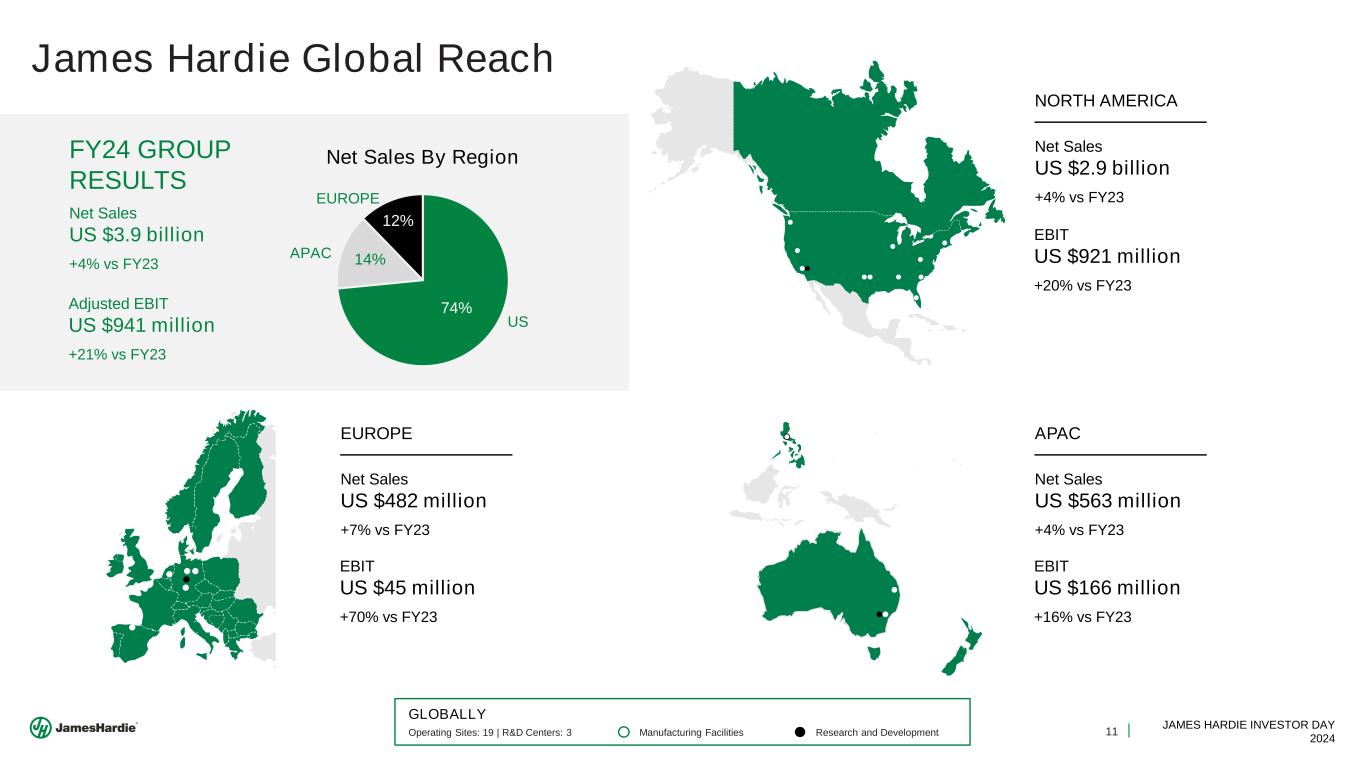 10 JAMES HARDIE INVESTOR DAY 2024 World’s #1 Producer and Marketer of High-Performance Fiber Cement Siding ~5K Employees Worldwide1 Standard Feet of Volume1 Globally~4Bn US Market Capitalization2 1. As of March 31st, 2024 2. Market data as of June 17th, 2024 3. Bloomberg Finance, LP 135+ Years James Hardie: Snapshot ASX: JHX; NYSE: JHX A Total Shareholder Return3 0% 50% 100% 150% 200% 250% 300% Since September 2022 5-Year 10-Year James Hardie ASX 200 S&P 500 $21Bn $14Bn