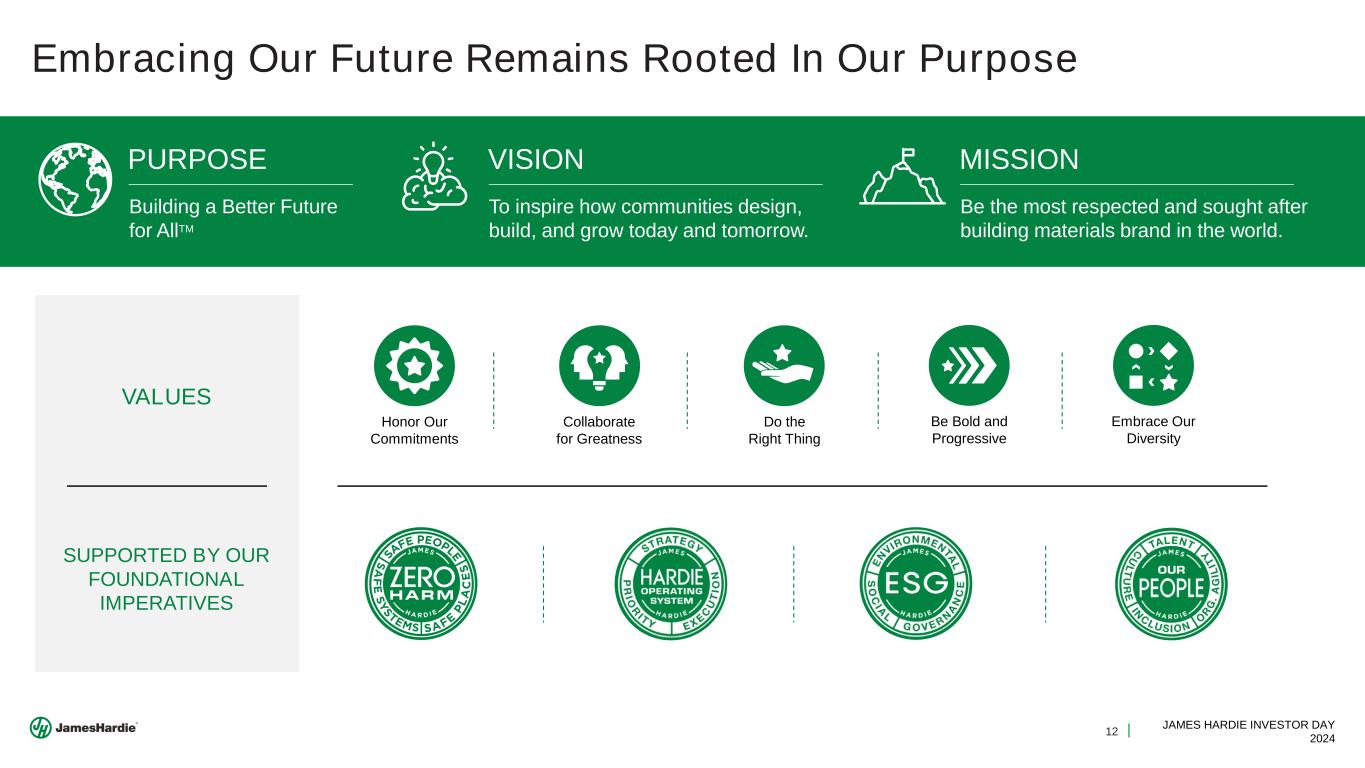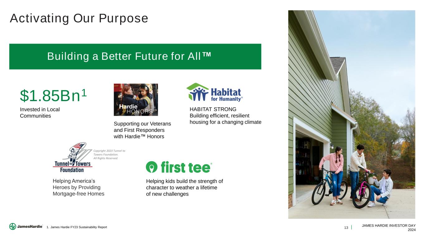 12 JAMES HARDIE INVESTOR DAY 2024 Embracing Our Future Remains Rooted In Our Purpose PURPOSE Building a Better Future for AllTM VISION To inspire how communities design, build, and grow today and tomorrow. MISSION Be the most respected and sought after building materials brand in the world. VALUES SUPPORTED BY OUR FOUNDATIONAL IMPERATIVES Honor Our Commitments Collaborate for Greatness Do the Right Thing Be Bold and Progressive Embrace Our Diversity