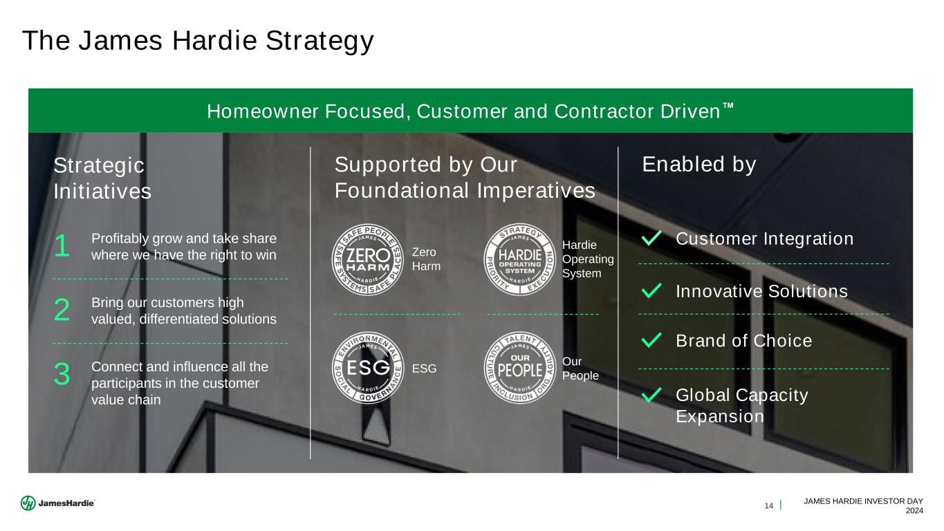13 JAMES HARDIE INVESTOR DAY 2024 Activating Our Purpose Building a Better Future for All Helping kids build the strength of character to weather a lifetime of new challenges Helping America’s Heroes by Providing Mortgage-free Homes Supporting our Veterans and First Responders with Hardie Honors HABITAT STRONG Building efficient, resilient housing for a changing climate $1.85Bn1 Invested in Local Communities Copyright 2023 Tunnel to Towers Foundation. All Rights Reserved. 1. James Hardie FY23 Sustainability Report