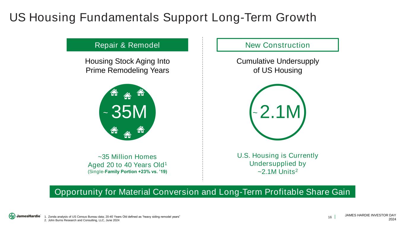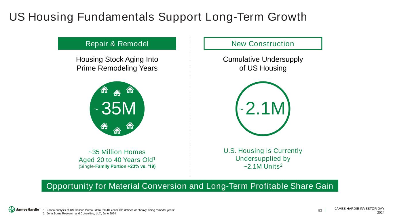 53 JAMES HARDIE INVESTOR DAY 2024 US Housing Fundamentals Support Long-Term Growth 1. Zonda analysis of US Census Bureau data; 20-40 Years Old defined as “heavy siding remodel years” 2. John Burns Research and Consulting, LLC, June 2024 Opportunity for Material Conversion and Long-Term Profitable Share Gain ~35 Million Homes Aged 20 to 40 Years Old1 (Single-Family Portion +23% vs. ’19) Housing Stock Aging Into Prime Remodeling Years 35M~ U.S. Housing is Currently Undersupplied by ~2.1M Units2 Cumulative Undersupply of US Housing 2.1M~ Repair & Remodel New Construction