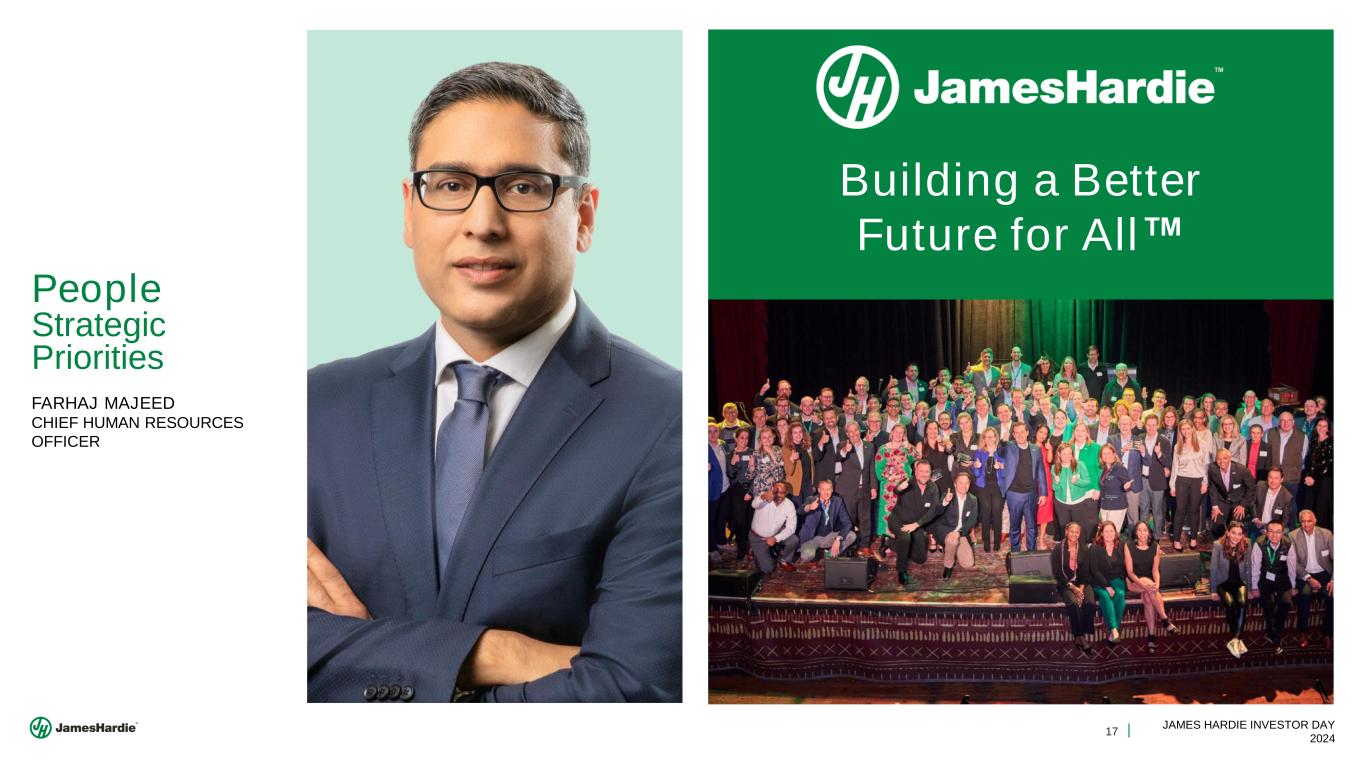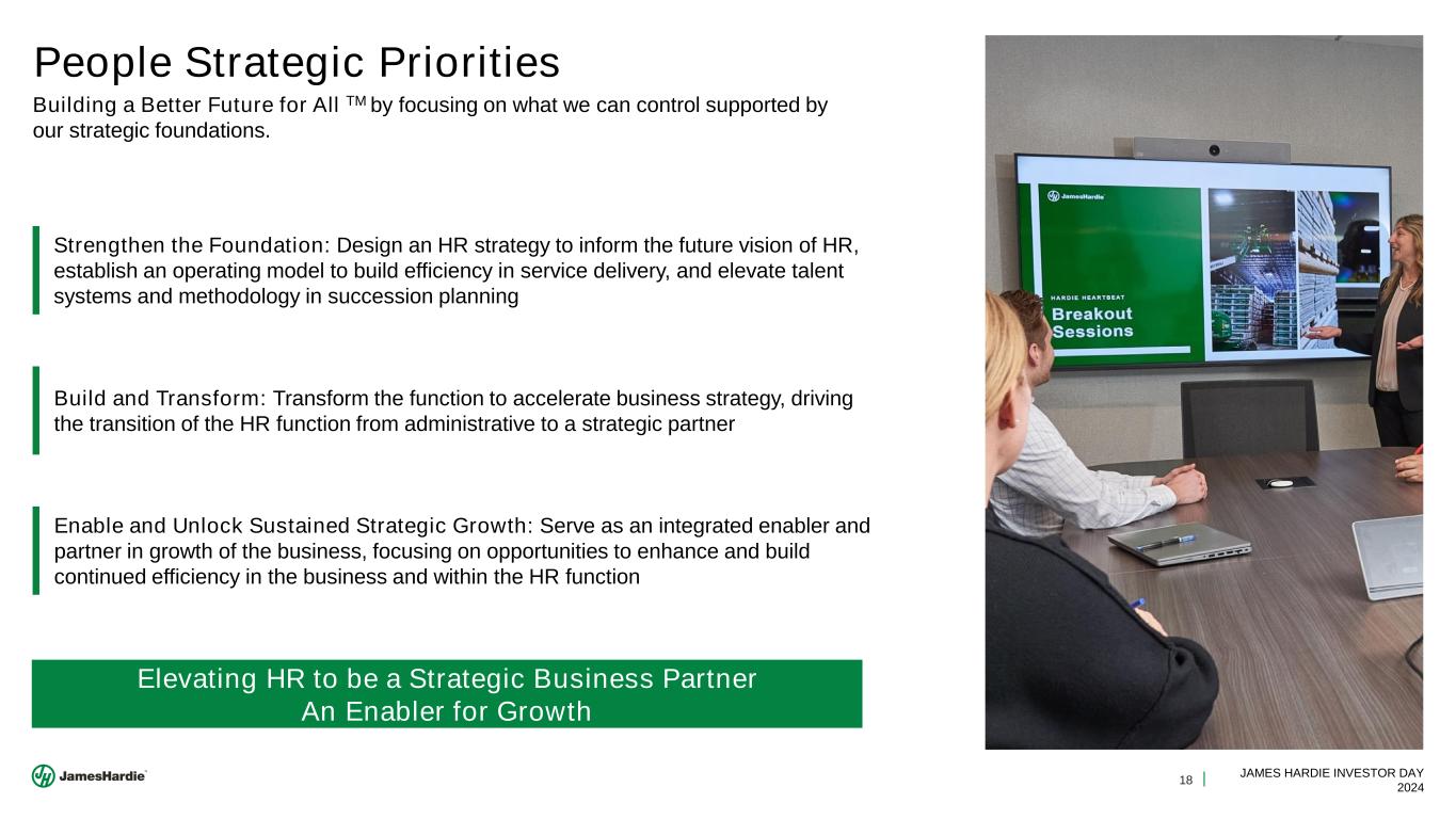 17 JAMES HARDIE INVESTOR DAY 2024 People Strategic Priorities FARHAJ MAJEED CHIEF HUMAN RESOURCES OFFICER Building a Better Future for All