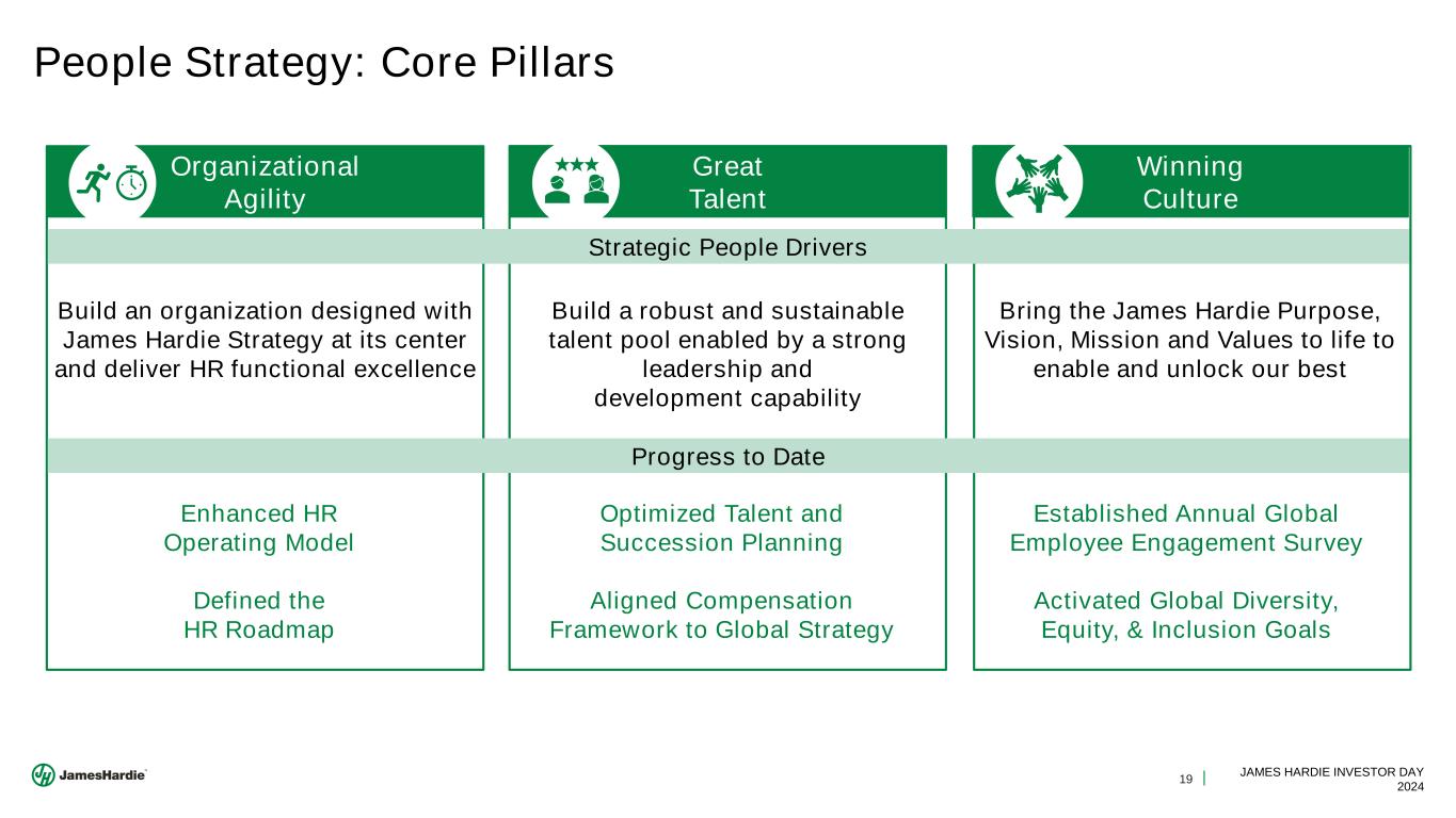 18 JAMES HARDIE INVESTOR DAY 2024 People Strategic Priorities Building a Better Future for All TM by focusing on what we can control supported by our strategic foundations. Elevating HR to be a Strategic Business Partner An Enabler for Growth Strengthen the Foundation: Design an HR strategy to inform the future vision of HR, establish an operating model to build efficiency in service delivery, and elevate talent systems and methodology in succession planning Build and Transform: Transform the function to accelerate business strategy, driving the transition of the HR function from administrative to a strategic partner Enable and Unlock Sustained Strategic Growth: Serve as an integrated enabler and partner in growth of the business, focusing on opportunities to enhance and build continued efficiency in the business and within the HR function