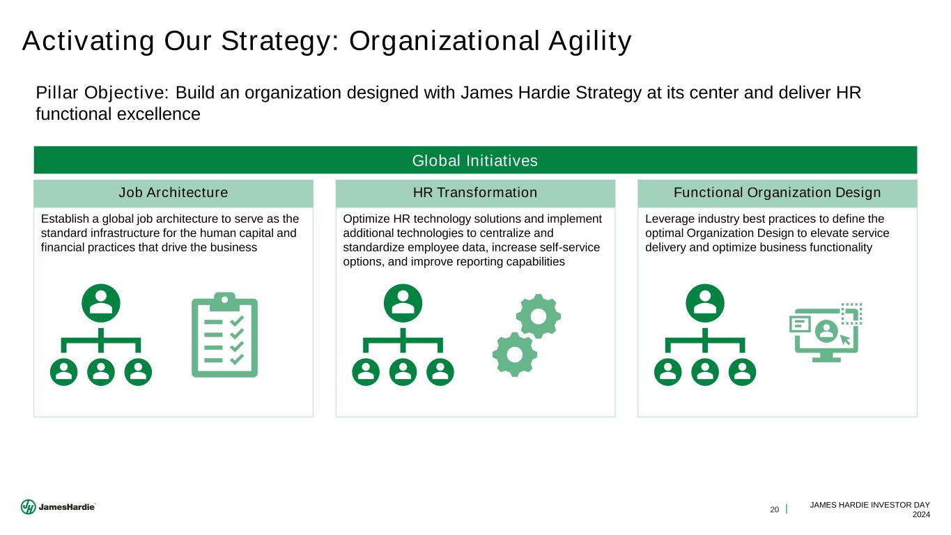 19 JAMES HARDIE INVESTOR DAY 2024 People Strategy: Core Pillars Strategic People Drivers Build an organization designed with James Hardie Strategy at its center and deliver HR functional excellence Organizational Agility Build a robust and sustainable talent pool enabled by a strong leadership and development capability Great Talent Bring the James Hardie Purpose, Vision, Mission and Values to life to enable and unlock our best Winning Culture Progress to Date Enhanced HR Operating Model Established Annual Global Employee Engagement Survey Optimized Talent and Succession Planning Defined the HR Roadmap Aligned Compensation Framework to Global Strategy Activated Global Diversity, Equity, & Inclusion Goals