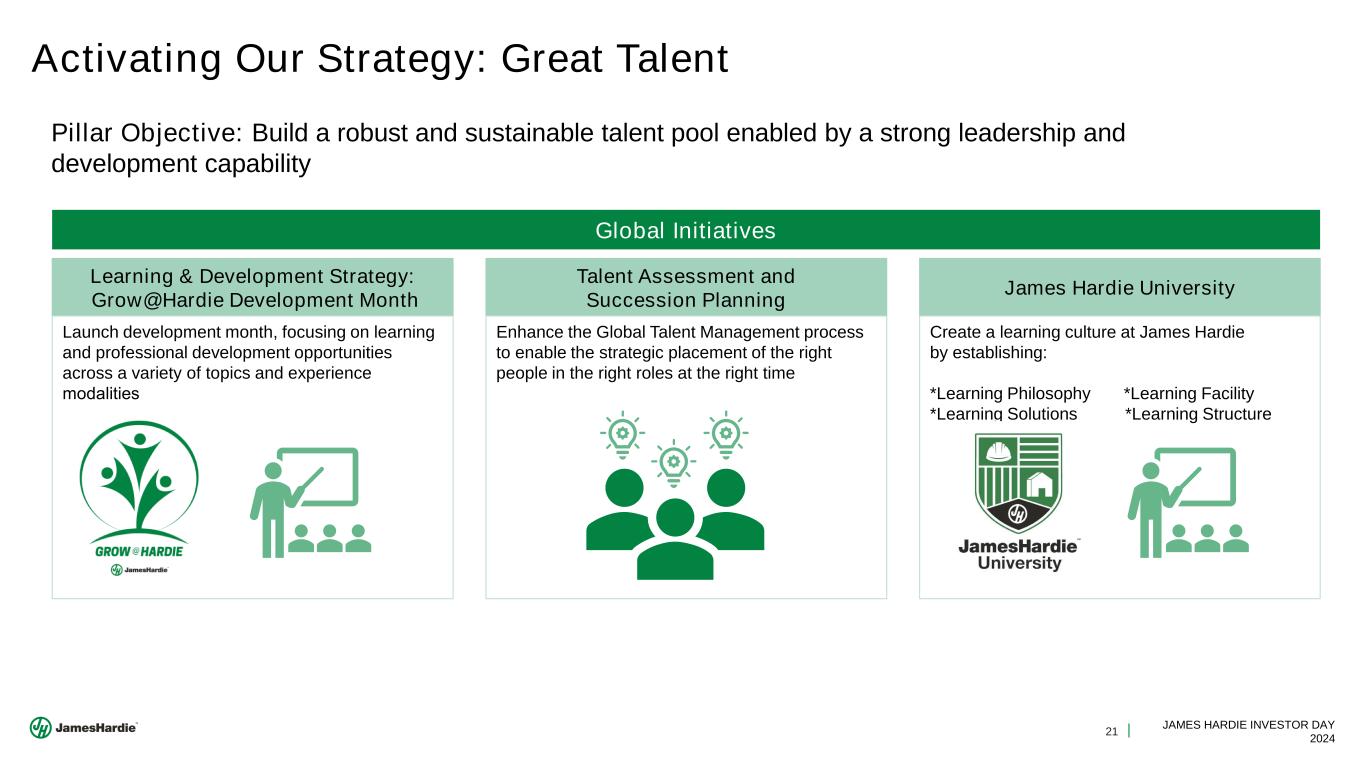 20 JAMES HARDIE INVESTOR DAY 2024 Activating Our Strategy: Organizational Agility Global Initiatives Pillar Objective: Build an organization designed with James Hardie Strategy at its center and deliver HR functional excellence Job Architecture HR Transformation Functional Organization Design Establish a global job architecture to serve as the standard infrastructure for the human capital and financial practices that drive the business Optimize HR technology solutions and implement additional technologies to centralize and standardize employee data, increase self-service options, and improve reporting capabilities Leverage industry best practices to define the optimal Organization Design to elevate service delivery and optimize business functionality