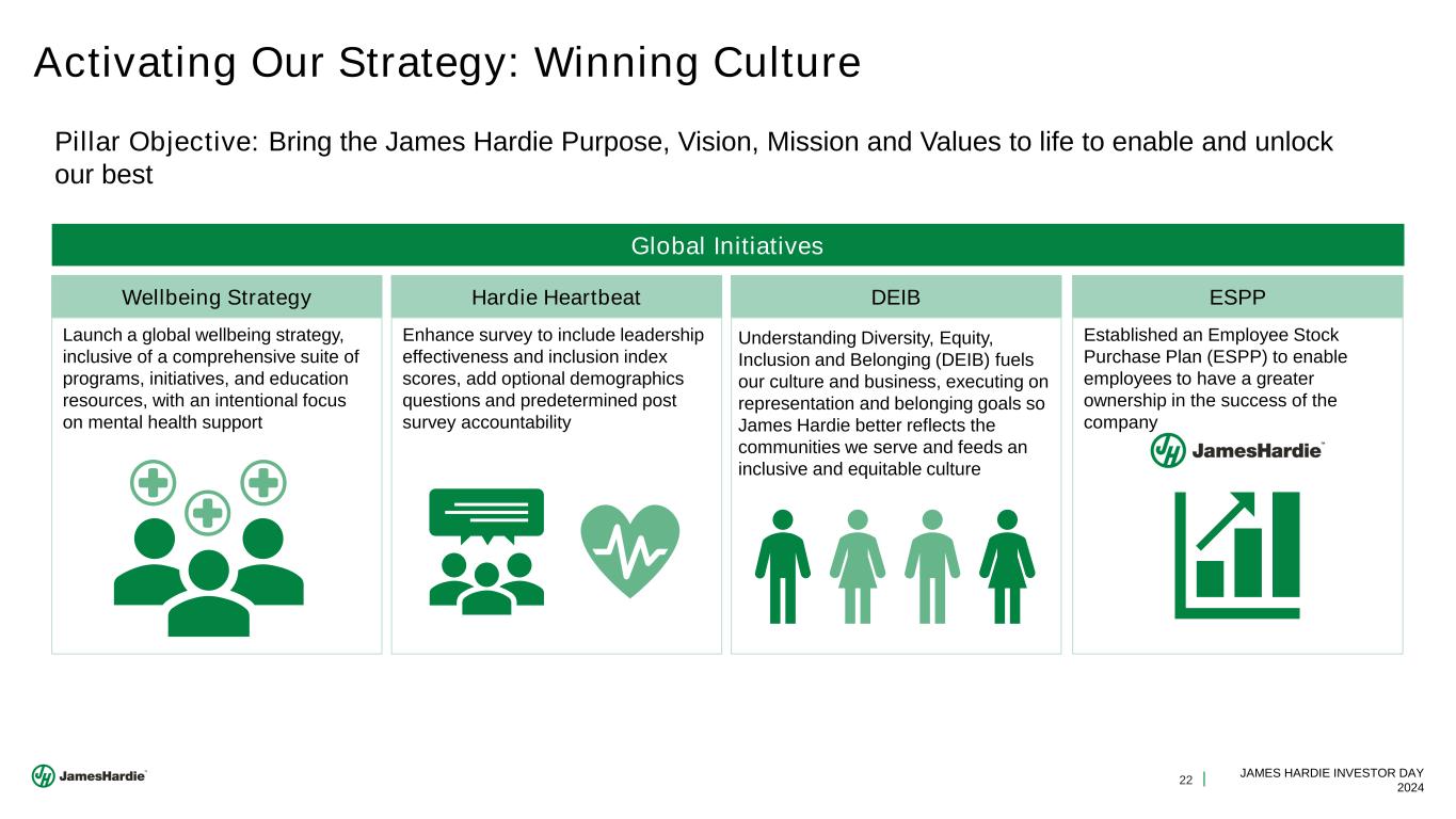 21 JAMES HARDIE INVESTOR DAY 2024 Activating Our Strategy: Great Talent Global Initiatives Learning & Development Strategy: Grow@Hardie Development Month Talent Assessment and Succession Planning James Hardie University Launch development month, focusing on learning and professional development opportunities across a variety of topics and experience modalities​ Enhance the Global Talent Management process to enable the strategic placement of the right people in the right roles at the right time Create a learning culture at James Hardie by establishing: *Learning Philosophy *Learning Facility *Learning Solutions *Learning Structure Pillar Objective: Build a robust and sustainable talent pool enabled by a strong leadership and development capability