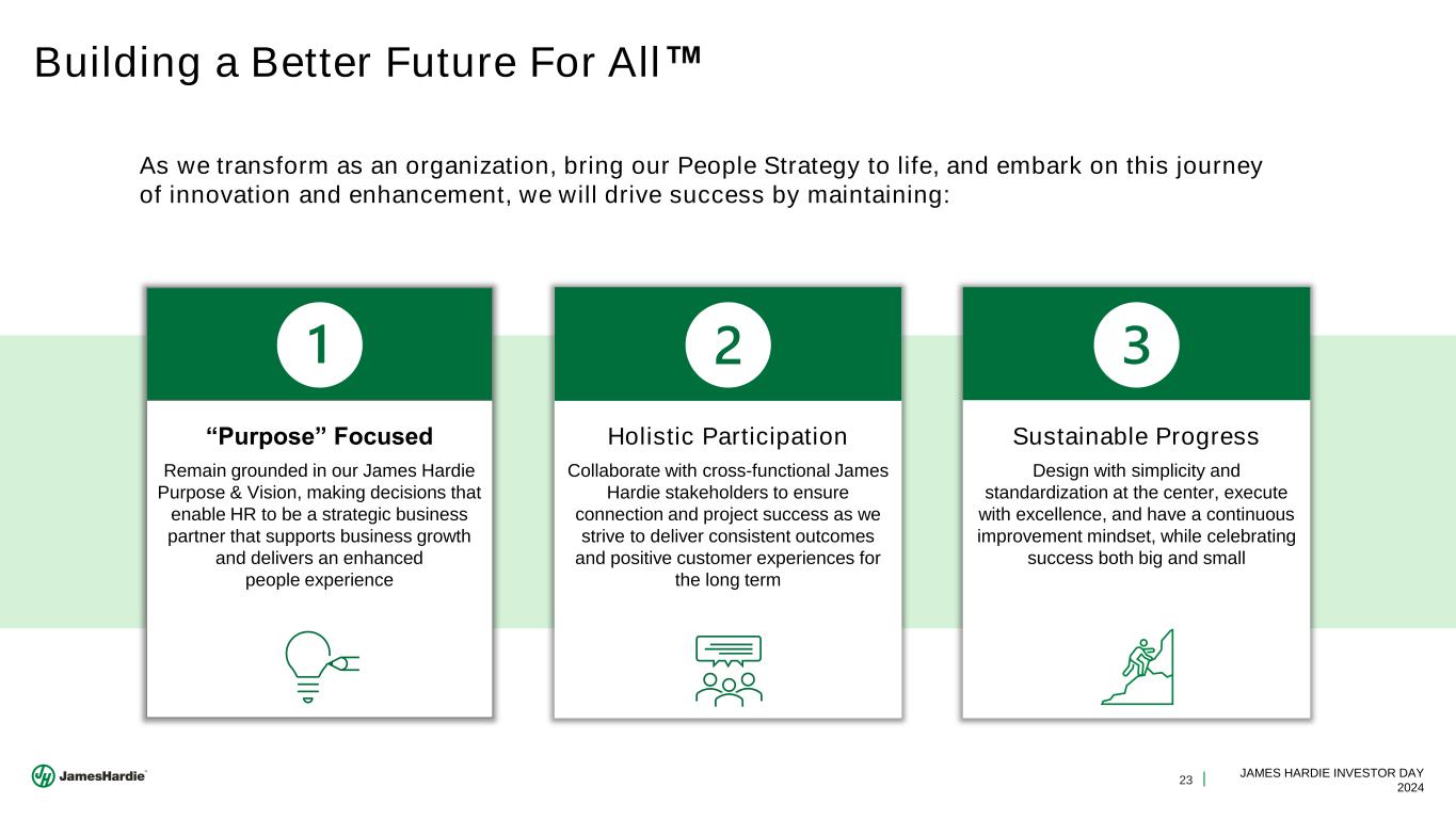 22 JAMES HARDIE INVESTOR DAY 2024 Activating Our Strategy: Winning Culture Global Initiatives Wellbeing Strategy Hardie Heartbeat Launch a global wellbeing strategy, inclusive of a comprehensive suite of programs, initiatives, and education resources, with an intentional focus on mental health support Enhance survey to include leadership effectiveness and inclusion index scores, add optional demographics questions and predetermined post survey accountability ESPP Established an Employee Stock Purchase Plan (ESPP) to enable employees to have a greater ownership in the success of the company DEIB Understanding Diversity, Equity, Inclusion and Belonging (DEIB) fuels our culture and business, executing on representation and belonging goals so James Hardie better reflects the communities we serve and feeds an inclusive and equitable culture Pillar Objective: Bring the James Hardie Purpose, Vision, Mission and Values to life to enable and unlock our best