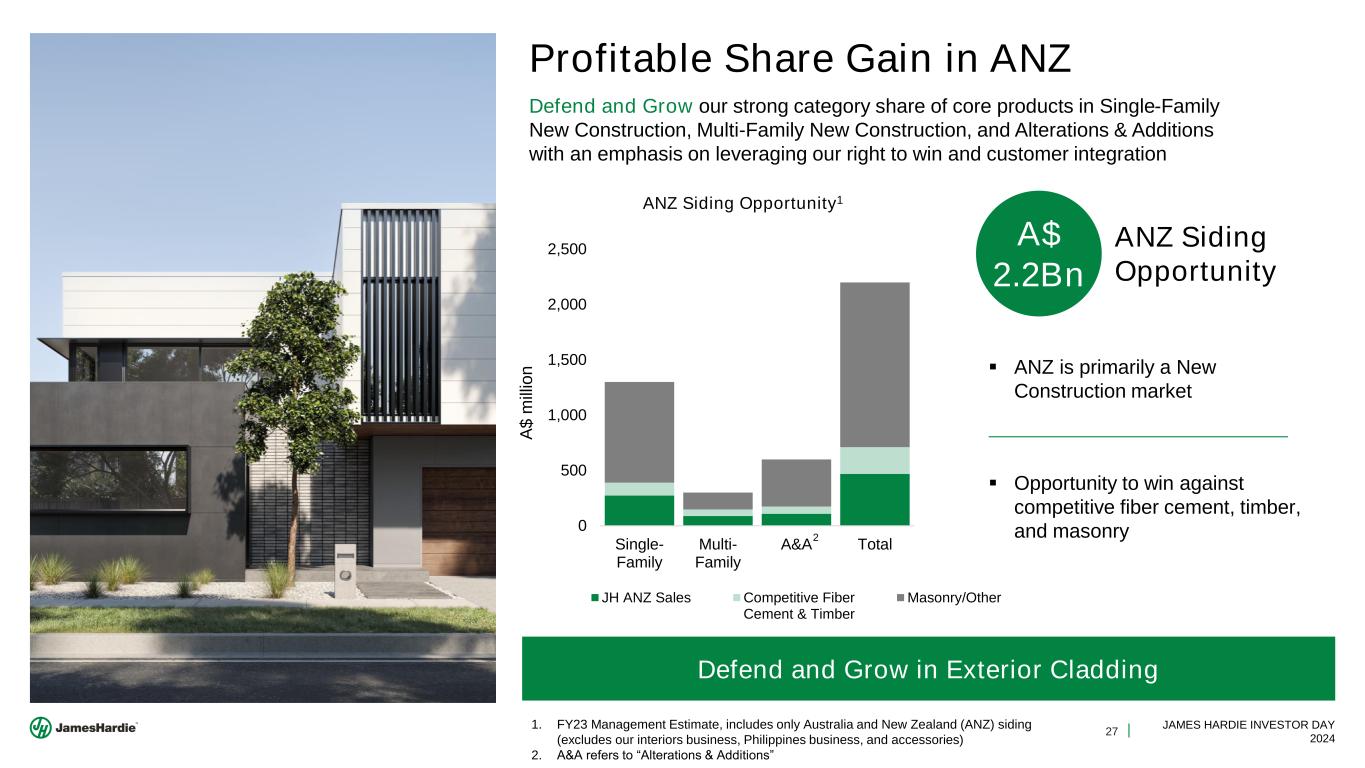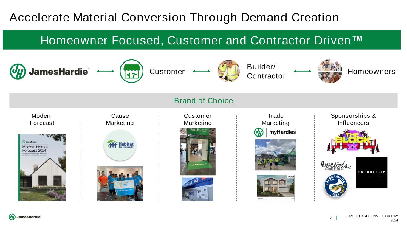 27 JAMES HARDIE INVESTOR DAY 2024 Profitable Share Gain in ANZ 0 500 1,000 1,500 2,000 2,500 Single- Family Multi- Family A&A Total A $ m ill io n ANZ Siding Opportunity1 JH ANZ Sales Competitive Fiber Cement & Timber Masonry/Other ▪ ANZ is primarily a New Construction market ▪ Opportunity to win against competitive fiber cement, timber, and masonry Defend and Grow in Exterior Cladding A$ 2.2Bn ANZ Siding Opportunity 1. FY23 Management Estimate, includes only Australia and New Zealand (ANZ) siding (excludes our interiors business, Philippines business, and accessories) 2. A&A refers to “Alterations & Additions” Defend and Grow our strong category share of core products in Single-Family New Construction, Multi-Family New Construction, and Alterations & Additions with an emphasis on leveraging our right to win and customer integration 2