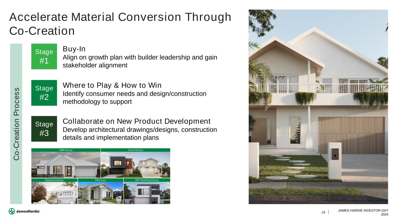 28 JAMES HARDIE INVESTOR DAY 2024 Accelerate Material Conversion Through Demand Creation Customer Builder/ Contractor Homeowners Modern Forecast Cause Marketing Customer Marketing Trade Marketing Sponsorships & Influencers Brand of Choice Homeowner Focused, Customer and Contractor Driven