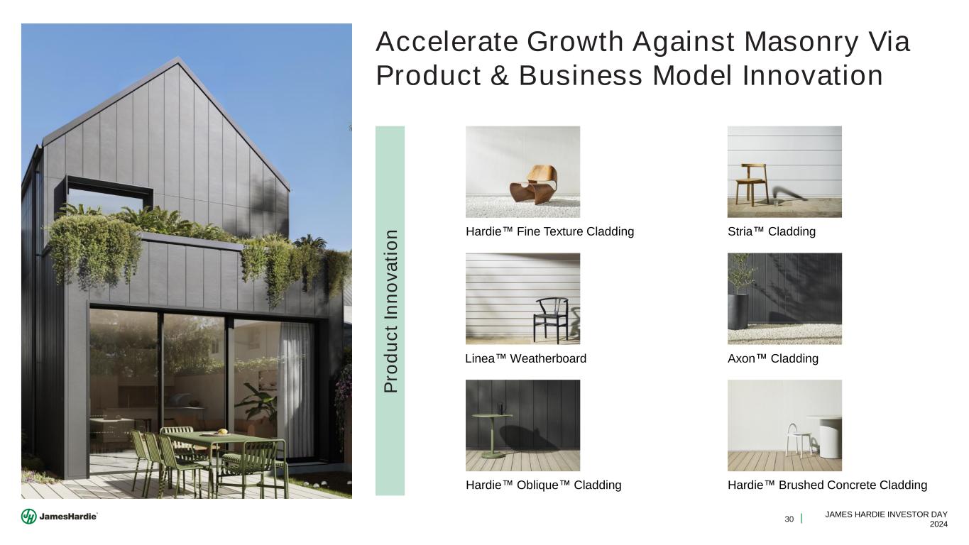 30 JAMES HARDIE INVESTOR DAY 2024 Hardie Oblique Cladding Axon CladdingLinea Weatherboard Stria Cladding Hardie Brushed Concrete Cladding Hardie Fine Texture Cladding Accelerate Growth Against Masonry Via Product & Business Model Innovation P ro d u c t In n o v a ti o n