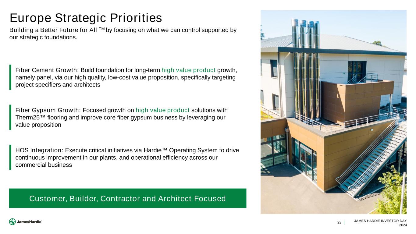 32 JAMES HARDIE INVESTOR DAY 2024 Europe Snapshot Christian Claus President Europe Net Sales €445 million +3% vs FY23 EBIT €42 million +65% vs FY23 FY24 SEGMENT NET SALES % of total (in USD) FY24 SEGMENT EBIT % of total (in USD) Europe North America and APAC Operating Sites: 5 | R&D Centers: 1 EUROPE Manufacturing Facilities Research and Development 12% 4% 445 NET SALES € millions 36 54 25 FY21 FY22 FY23 FY24 42 ADJUSTED EBIT € millions 10.4% 12.9% 5.8% 9.3% 351 421 432 FY21 FY22 FY23 FY24 ADJUSTED EBIT MARGIN (%) 1. Average number of employees for Fiscal Year 2024 1,043 EMPLOYEES1