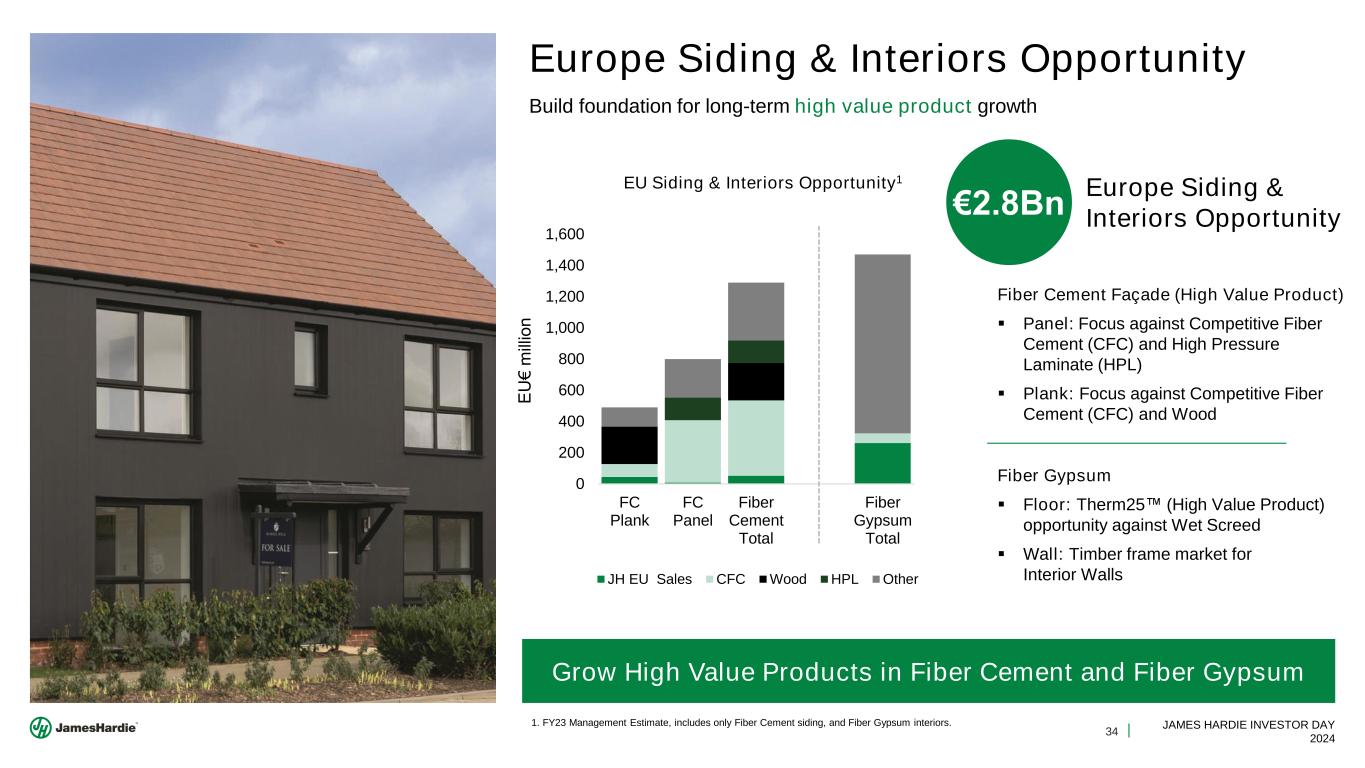 33 JAMES HARDIE INVESTOR DAY 2024 Europe Strategic Priorities Building a Better Future for All TM by focusing on what we can control supported by our strategic foundations. Fiber Cement Growth: Build foundation for long-term high value product growth, namely panel, via our high quality, low-cost value proposition, specifically targeting project specifiers and architects Fiber Gypsum Growth: Focused growth on high value product solutions with Therm25 flooring and improve core fiber gypsum business by leveraging our value proposition HOS Integration: Execute critical initiatives via Hardie Operating System to drive continuous improvement in our plants, and operational efficiency across our commercial business Customer, Builder, Contractor and Architect Focused