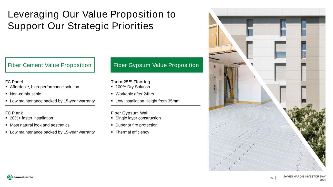 34 JAMES HARDIE INVESTOR DAY 2024 Fiber Cement Façade (High Value Product) ▪ Panel: Focus against Competitive Fiber Cement (CFC) and High Pressure Laminate (HPL) ▪ Plank: Focus against Competitive Fiber Cement (CFC) and Wood Fiber Gypsum ▪ Floor: Therm25 (High Value Product) opportunity against Wet Screed ▪ Wall: Timber frame market for Interior Walls Europe Siding & Interiors Opportunity Grow High Value Products in Fiber Cement and Fiber Gypsum 0 200 400 600 800 1,000 1,200 1,400 1,600 FC Plank FC Panel Fiber Cement Total Fiber Gypsum Total E U € m ill io n EU Siding & Interiors Opportunity1 JH EU Sales CFC Wood HPL Other €2.8Bn Europe Siding & Interiors Opportunity Build foundation for long-term high value product growth 1. FY23 Management Estimate, includes only Fiber Cement siding, and Fiber Gypsum interiors.