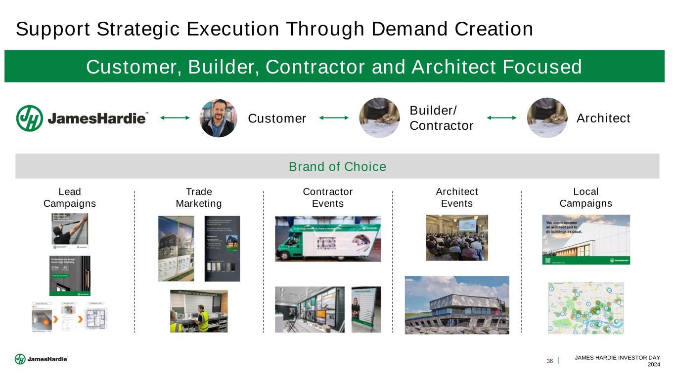 36 JAMES HARDIE INVESTOR DAY 2024 Support Strategic Execution Through Demand Creation Architect Lead Campaigns Trade Marketing Contractor Events Architect Events Local Campaigns Brand of Choice Builder/ Contractor Customer Customer, Builder, Contractor and Architect Focused