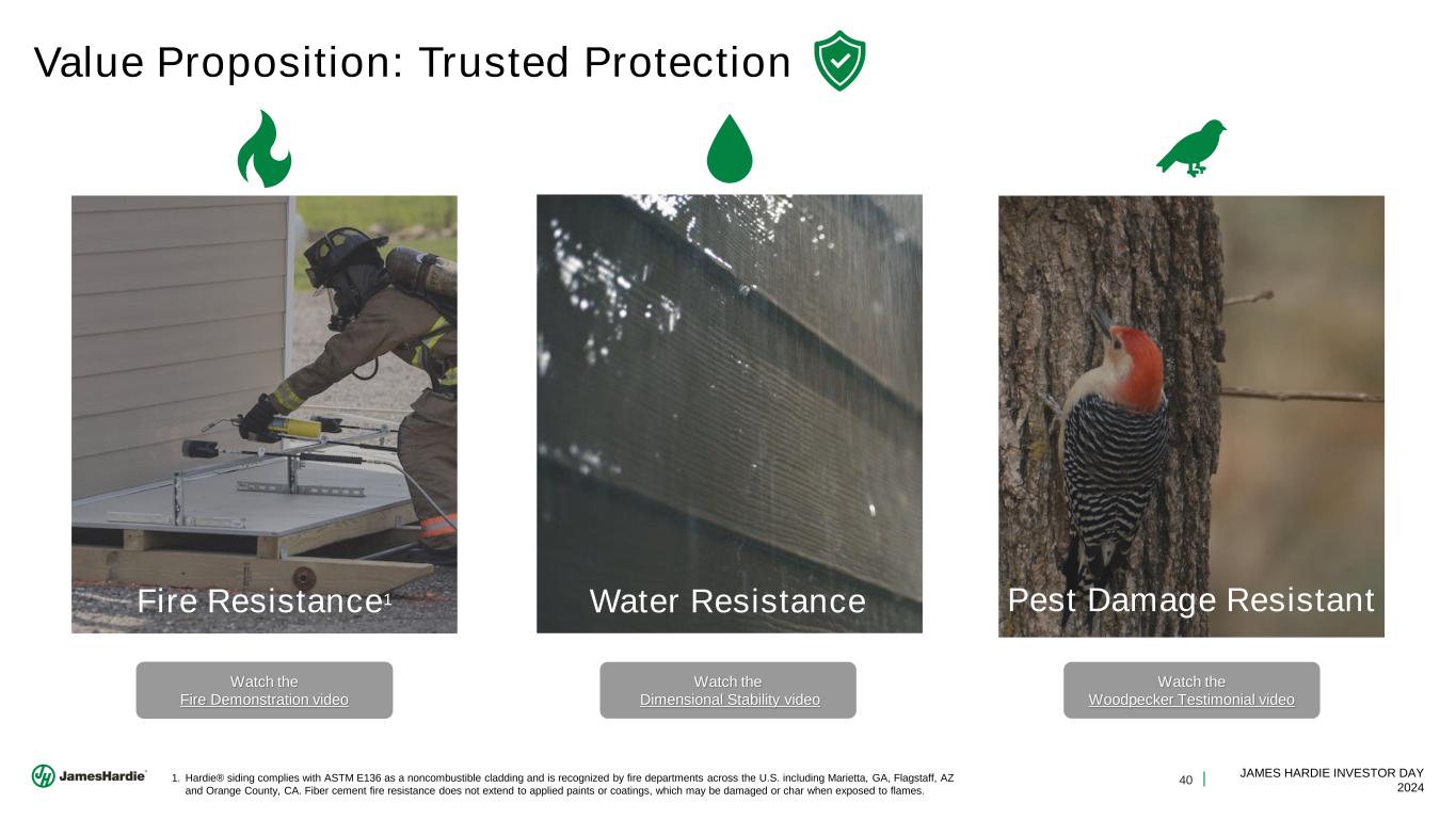 40 JAMES HARDIE INVESTOR DAY 2024 Value Proposition: Trusted Protection 1. Hardie® siding complies with ASTM E136 as a noncombustible cladding and is recognized by fire departments across the U.S. including Marietta, GA, Flagstaff, AZ and Orange County, CA. Fiber cement fire resistance does not extend to applied paints or coatings, which may be damaged or char when exposed to flames. Water ResistanceFire Resistance1 Pest Damage Resistant Watch the Fire Demonstration video Watch the Dimensional Stability video Watch the Woodpecker Testimonial video