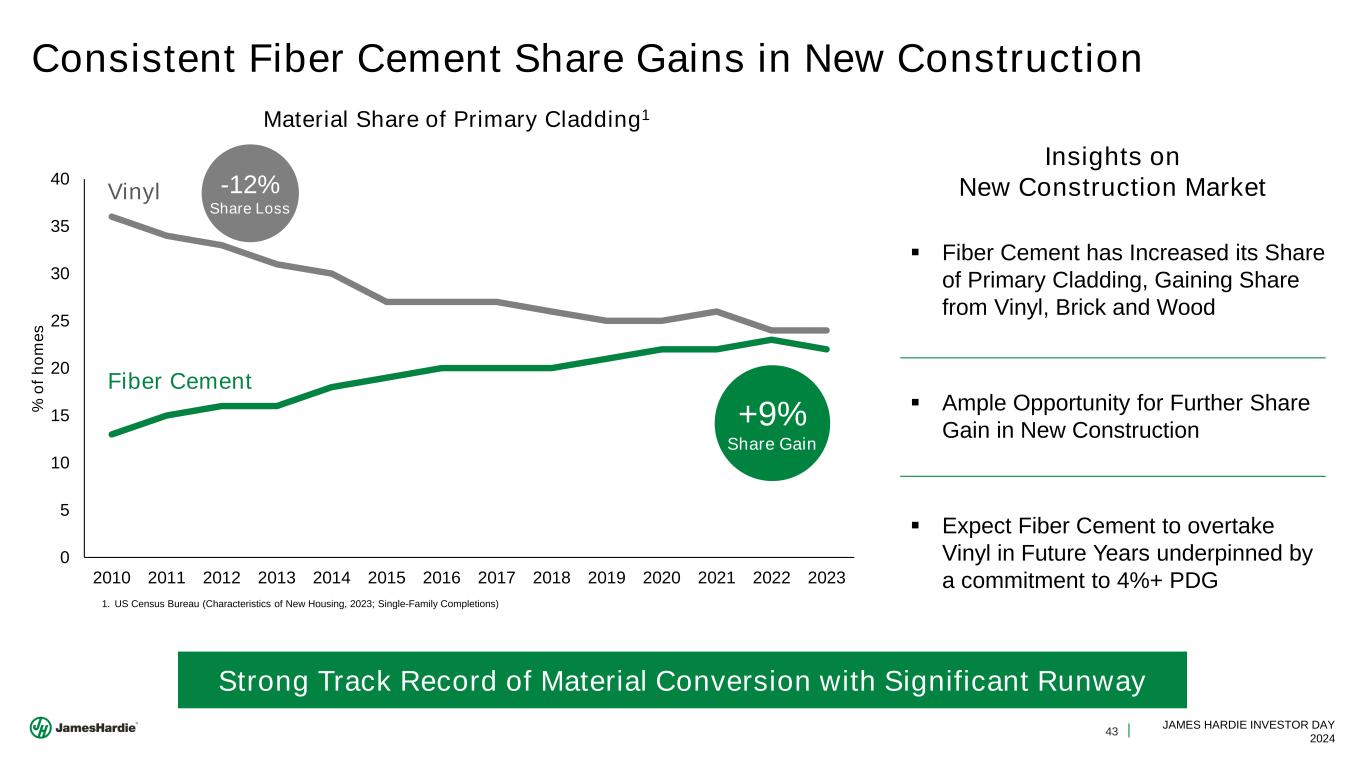 42 JAMES HARDIE INVESTOR DAY 2024 - 2,000 4,000 6,000 8,000 10,000 12,000 New Construction Repair & Remodel Total V o lu m e - M M S F US Siding Opportunity1 Fiber Cement Vinyl & Wood Other Long Runway for Growth Through Material Conversion US Siding Opportunity 1. NAHB Home Innovation 2022 + James Hardie CY22 reported volumes, Total assumes James Hardie 90% category share. ▪ Opportunity in R&R to win against vinyl and other wood-look substrates ▪ New Construction remains a significant opportunity for material conversion US Siding Opportunity ~$10Bn ~10Bnsf Accelerate growth in key end markets by driving material conversion.