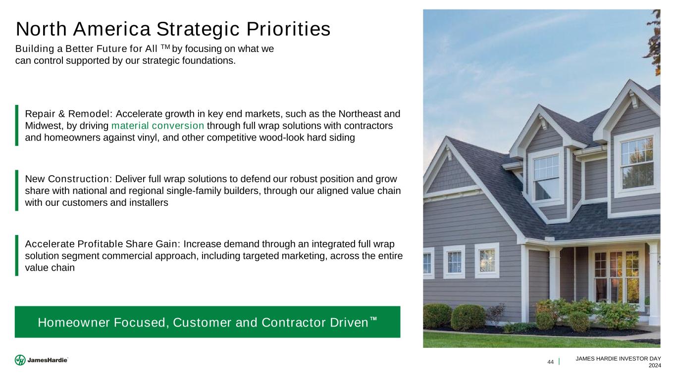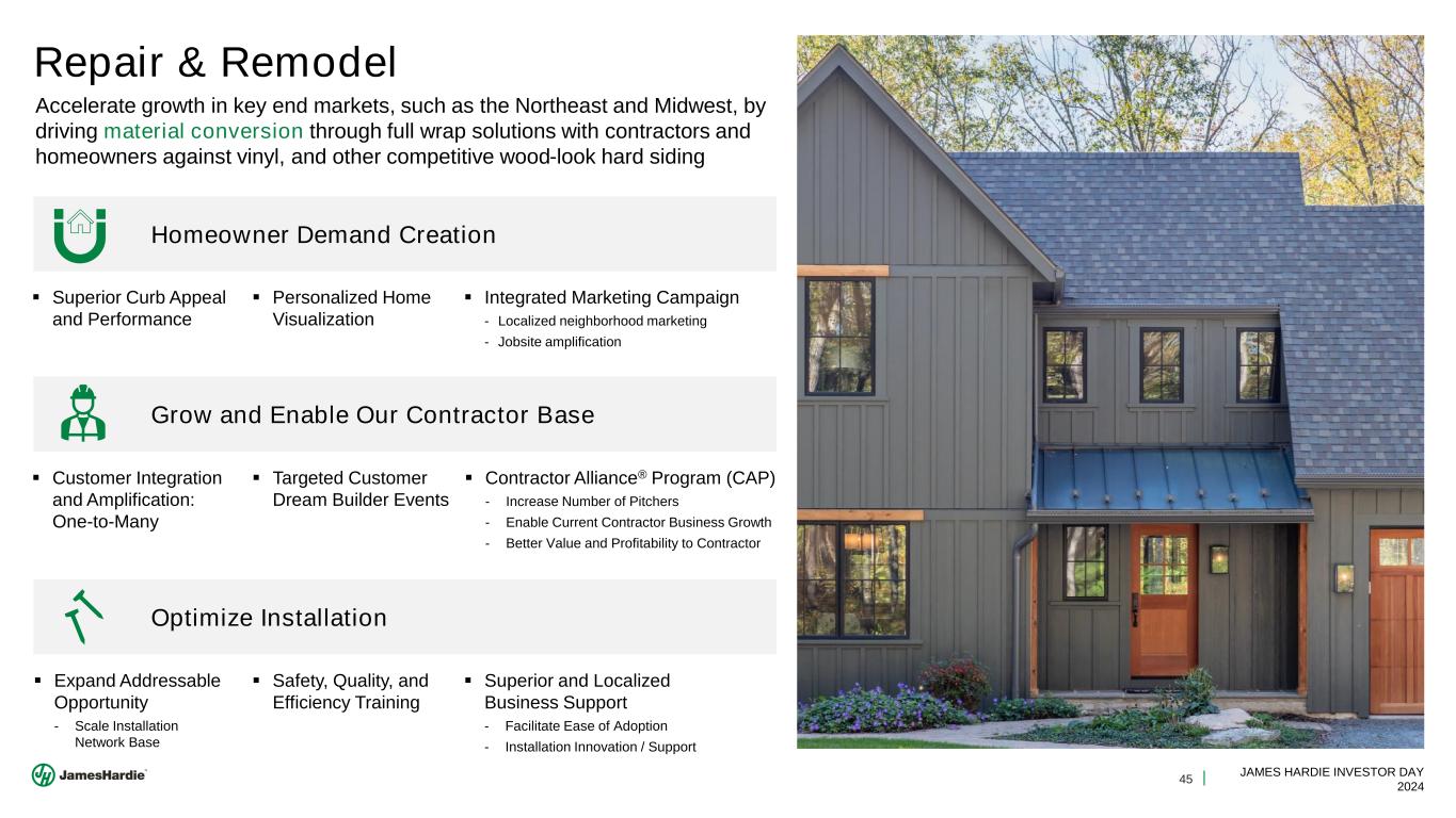 44 JAMES HARDIE INVESTOR DAY 2024 North America Strategic Priorities Building a Better Future for All TM by focusing on what we can control supported by our strategic foundations. Repair & Remodel: Accelerate growth in key end markets, such as the Northeast and Midwest, by driving material conversion through full wrap solutions with contractors and homeowners against vinyl, and other competitive wood-look hard siding New Construction: Deliver full wrap solutions to defend our robust position and grow share with national and regional single-family builders, through our aligned value chain with our customers and installers Accelerate Profitable Share Gain: Increase demand through an integrated full wrap solution segment commercial approach, including targeted marketing, across the entire value chain Homeowner Focused, Customer and Contractor Driven