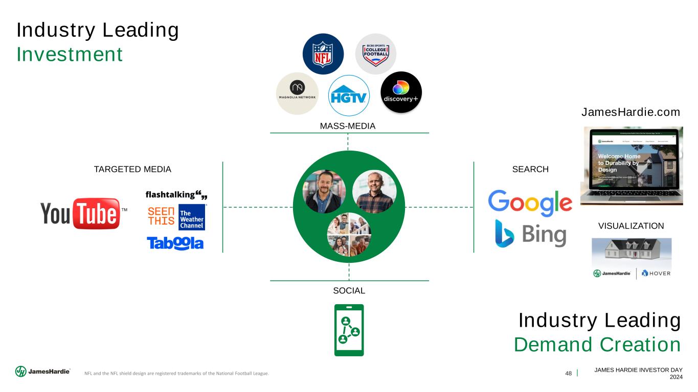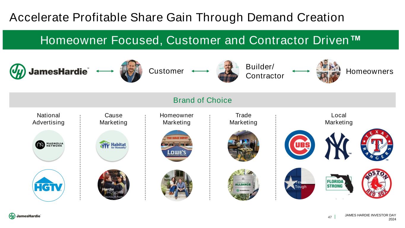 47 JAMES HARDIE INVESTOR DAY 2024 Accelerate Profitable Share Gain Through Demand Creation Customer Builder/ Contractor Homeowners National Advertising Cause Marketing Homeowner Marketing Trade Marketing Local Marketing Texas Tough Brand of Choice Homeowner Focused, Customer and Contractor Driven