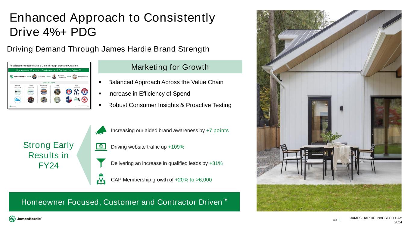 48 JAMES HARDIE INVESTOR DAY 2024 Industry Leading Investment MASS-MEDIA SOCIAL Industry Leading Demand Creation TARGETED MEDIA SEARCH JamesHardie.com VISUALIZATION NFL and the NFL shield design are registered trademarks of the National Football League.
