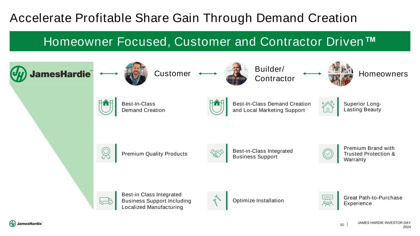 49 JAMES HARDIE INVESTOR DAY 2024 48 JAMES HARDIE INVESTOR DAY 2024 Accelerate Profitable Share Gain Through Demand Creation Customer Builder/ Contractor Homeowners National Advertising Cause Marketing Homeowner Marketing Trade Marketing Local Marketing Texas Tough Brand of Choice Homeowner Focused, Customer and Contractor Driven Enhanced Approach to Consistently Drive 4%+ PDG Marketing for Growth ▪ Balanced Approach Across the Value Chain ▪ Increase in Efficiency of Spend ▪ Robust Consumer Insights & Proactive Testing Driving Demand Through James Hardie Brand Strength Homeowner Focused, Customer and Contractor Driven Increasing our aided brand awareness by +7 points Driving website traffic up +109% Delivering an increase in qualified leads by +31% CAP Membership growth of +20% to >6,000 Strong Early Results in FY24