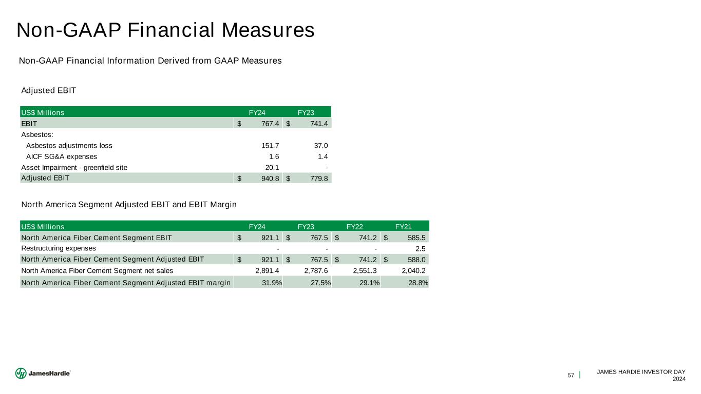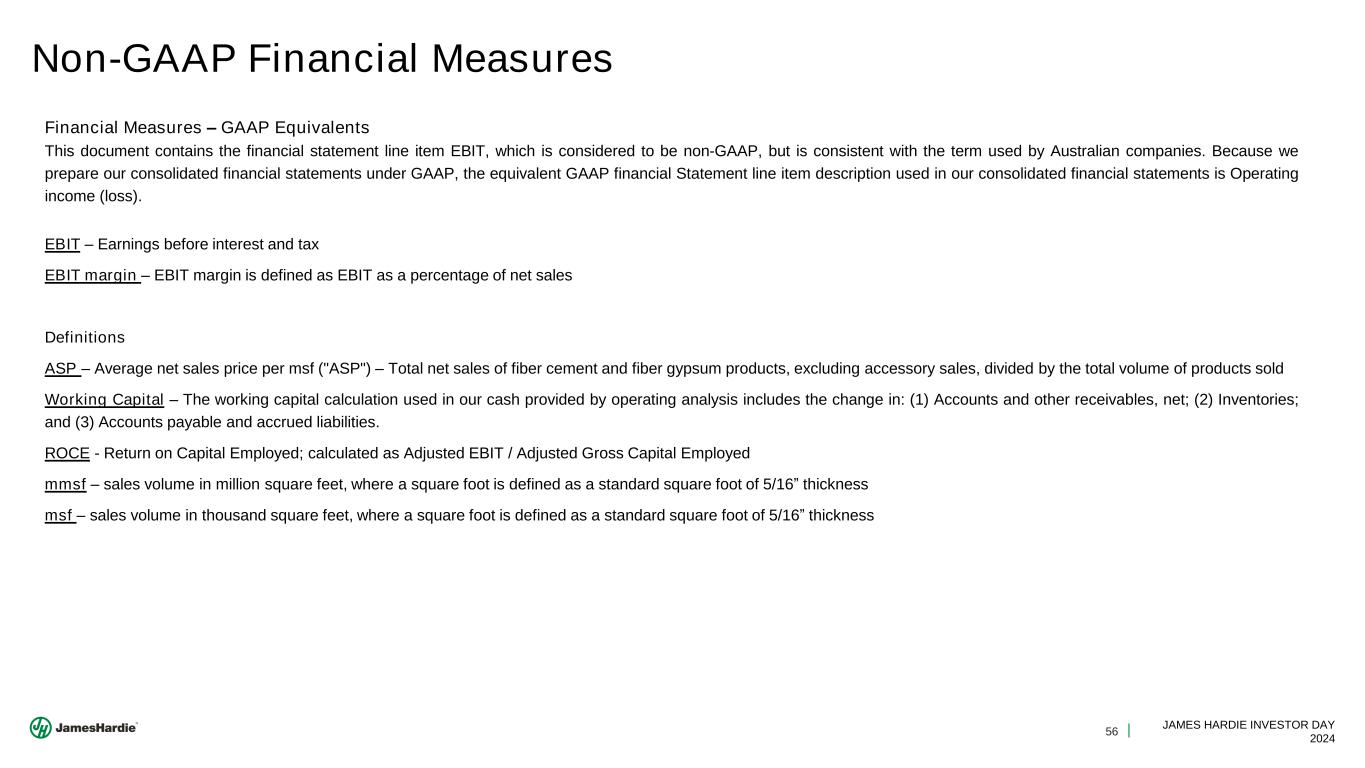 56 JAMES HARDIE INVESTOR DAY 2024 Non-GAAP Financial Measures Financial Measures – GAAP Equivalents This document contains the financial statement line item EBIT, which is considered to be non-GAAP, but is consistent with the term used by Australian companies. Because we prepare our consolidated financial statements under GAAP, the equivalent GAAP financial Statement line item description used in our consolidated financial statements is Operating income (loss). EBIT – Earnings before interest and tax EBIT margin – EBIT margin is defined as EBIT as a percentage of net sales Definitions ASP – Average net sales price per msf ("ASP") – Total net sales of fiber cement and fiber gypsum products, excluding accessory sales, divided by the total volume of products sold Working Capital – The working capital calculation used in our cash provided by operating analysis includes the change in: (1) Accounts and other receivables, net; (2) Inventories; and (3) Accounts payable and accrued liabilities. ROCE - Return on Capital Employed; calculated as Adjusted EBIT / Adjusted Gross Capital Employed mmsf – sales volume in million square feet, where a square foot is defined as a standard square foot of 5/16” thickness msf – sales volume in thousand square feet, where a square foot is defined as a standard square foot of 5/16” thickness