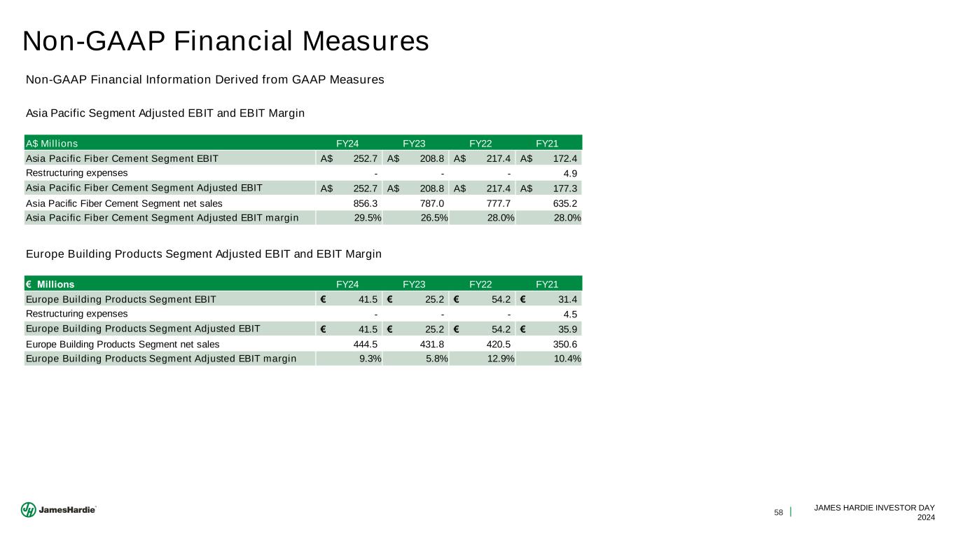 58 JAMES HARDIE INVESTOR DAY 2024 Non-GAAP Financial Measures Asia Pacific Segment Adjusted EBIT and EBIT Margin A$ Millions FY24 FY23 FY22 FY21 Asia Pacific Fiber Cement Segment EBIT 252.7A$ 208.8A$ 217.4A$ 172.4A$ Restructuring expenses - - - 4.9 Asia Pacific Fiber Cement Segment Adjusted EBIT 252.7A$ 208.8A$ 217.4A$ 177.3A$ Asia Pacific Fiber Cement Segment net sales 856.3 787.0 777.7 635.2 Asia Pacific Fiber Cement Segment Adjusted EBIT margin 29.5% 26.5% 28.0% 28.0% Europe Building Products Segment Adjusted EBIT and EBIT Margin € Millions FY24 FY23 FY22 FY21 Europe Building Products Segment EBIT 41.5€ 25.2€ 54.2€ 31.4€ Restructuring expenses - - - 4.5 Europe Building Products Segment Adjusted EBIT 41.5€ 25.2€ 54.2€ 35.9€ Europe Building Products Segment net sales 444.5 431.8 420.5 350.6 Europe Building Products Segment Adjusted EBIT margin 9.3% 5.8% 12.9% 10.4% Non-GAAP Financial Information Derived from GAAP Measures
