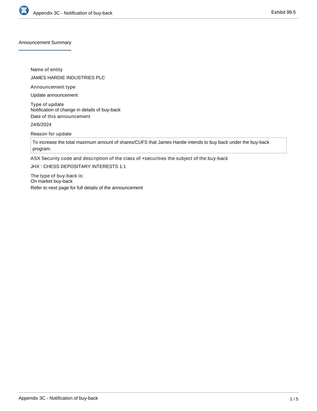 Appendix 3C - Notification of buy-back Appendix 3C - Notification of buy-back 1 / 5 Announcement Summary Name of entity JAMES HARDIE INDUSTRIES PLC Announcement type Update announcement Type of update Date of this announcement 24/6/2024 Reason for update To increase the total maximum amount of shares/CUFS that James Hardie intends to buy back under the buy-back program. ASX Security code and description of the class of +securities the subject of the buy-back JHX : CHESS DEPOSITARY INTERESTS 1:1 The type of buy-back is: Refer to next page for full details of the announcement On market buy-back Notification of change in details of buy-back Exhibit 99.5