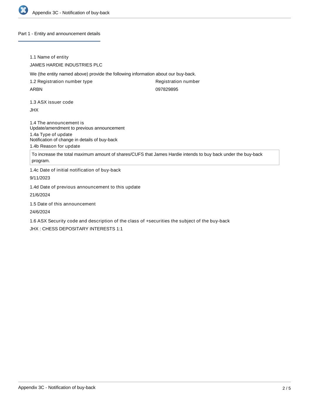 Appendix 3C - Notification of buy-back Appendix 3C - Notification of buy-back 2 / 5 Part 1 - Entity and announcement details 1.1 Name of entity JAMES HARDIE INDUSTRIES PLC We (the entity named above) provide the following information about our buy-back. 1.2 Registration number type ARBN Registration number 097829895 1.3 ASX issuer code JHX 1.4 The announcement is 1.4a Type of update 1.4b Reason for update To increase the total maximum amount of shares/CUFS that James Hardie intends to buy back under the buy-back program. 1.4c Date of initial notification of buy-back 9/11/2023 1.4d Date of previous announcement to this update 21/6/2024 1.5 Date of this announcement 24/6/2024 1.6 ASX Security code and description of the class of +securities the subject of the buy-back JHX : CHESS DEPOSITARY INTERESTS 1:1 Notification of change in details of buy-back Update/amendment to previous announcement