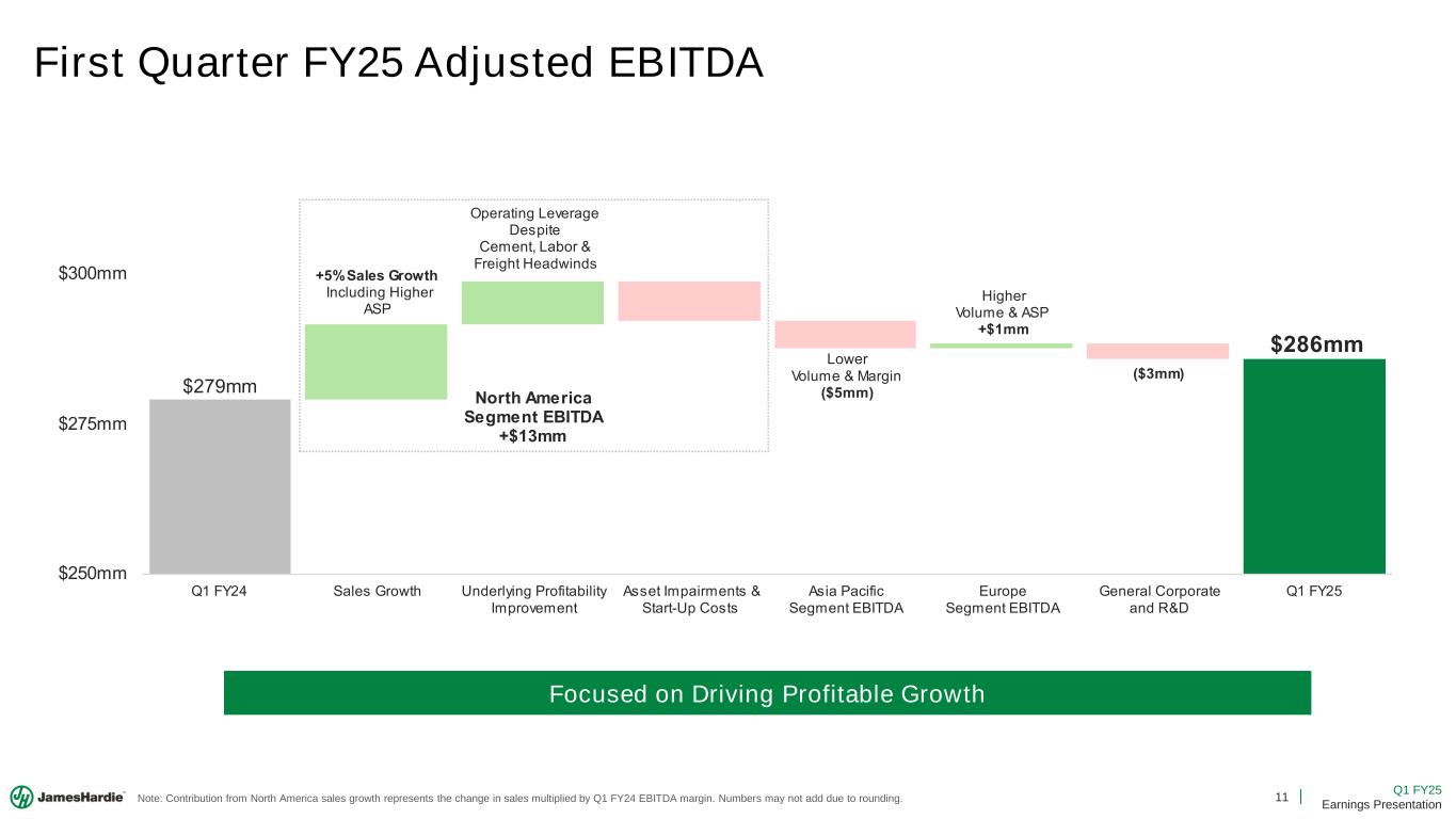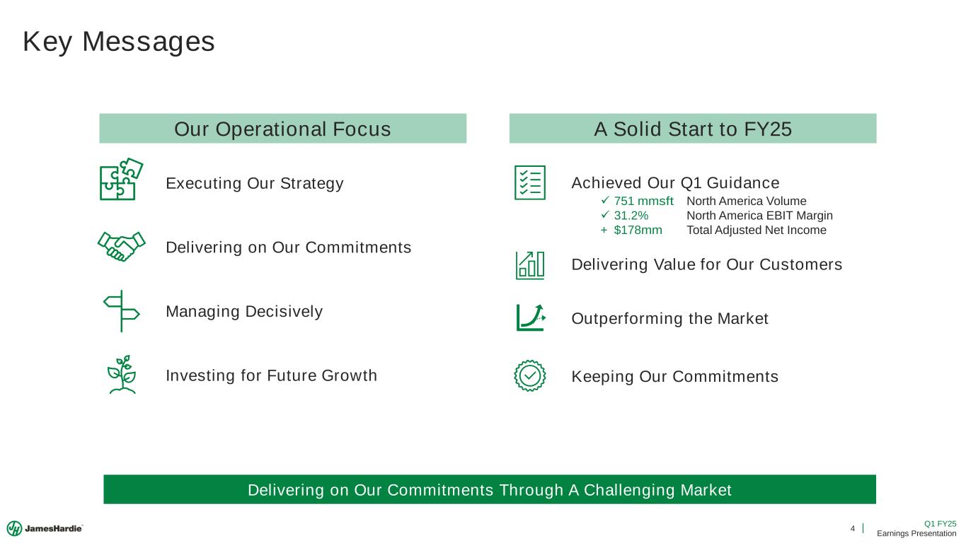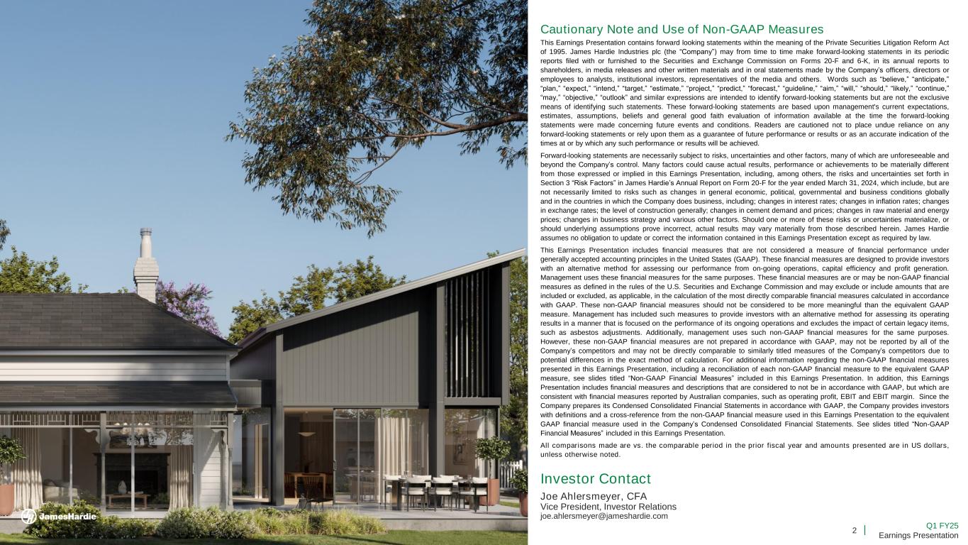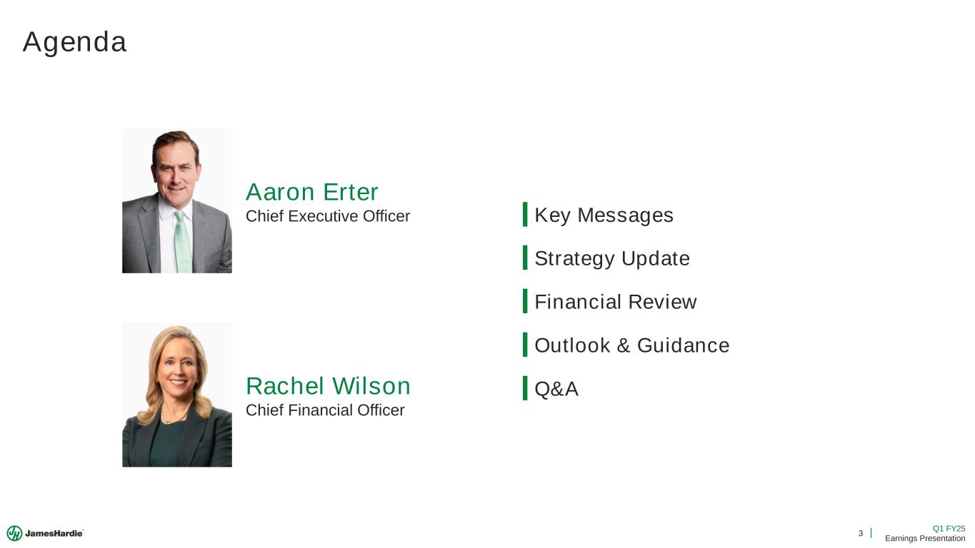 2 Q1 FY25 Earnings Presentation Cautionary Note and Use of Non-GAAP Measures This Earnings Presentation contains forward looking statements within the meaning of the Private Securities Litigation Reform Act of 1995. James Hardie Industries plc (the “Company”) may from time to time make forward-looking statements in its periodic reports filed with or furnished to the Securities and Exchange Commission on Forms 20-F and 6-K, in its annual reports to shareholders, in media releases and other written materials and in oral statements made by the Company’s officers, directors or employees to analysts, institutional investors, representatives of the media and others. Words such as “believe,” “anticipate,” “plan,” “expect,” “intend,” “target,” “estimate,” “project,” “predict,” “forecast,” “guideline,” “aim,” “will,” “should,” “likely,” “continue,” “may,” “objective,” “outlook” and similar expressions are intended to identify forward-looking statements but are not the exclusive means of identifying such statements. These forward-looking statements are based upon management's current expectations, estimates, assumptions, beliefs and general good faith evaluation of information available at the time the forward-looking statements were made concerning future events and conditions. Readers are cautioned not to place undue reliance on any forward-looking statements or rely upon them as a guarantee of future performance or results or as an accurate indication of the times at or by which any such performance or results will be achieved. Forward-looking statements are necessarily subject to risks, uncertainties and other factors, many of which are unforeseeable and beyond the Company’s control. Many factors could cause actual results, performance or achievements to be materially different from those expressed or implied in this Earnings Presentation, including, among others, the risks and uncertainties set forth in Section 3 “Risk Factors” in James Hardie’s Annual Report on Form 20-F for the year ended March 31, 2024, which include, but are not necessarily limited to risks such as changes in general economic, political, governmental and business conditions globally and in the countries in which the Company does business, including; changes in interest rates; changes in inflation rates; changes in exchange rates; the level of construction generally; changes in cement demand and prices; changes in raw material and energy prices; changes in business strategy and various other factors. Should one or more of these risks or uncertainties materialize, or should underlying assumptions prove incorrect, actual results may vary materially from those described herein. James Hardie assumes no obligation to update or correct the information contained in this Earnings Presentation except as required by law. This Earnings Presentation includes financial measures that are not considered a measure of financial performance under generally accepted accounting principles in the United States (GAAP). These financial measures are designed to provide investors with an alternative method for assessing our performance from on-going operations, capital efficiency and profit generation. Management uses these financial measures for the same purposes. These financial measures are or may be non-GAAP financial measures as defined in the rules of the U.S. Securities and Exchange Commission and may exclude or include amounts that are included or excluded, as applicable, in the calculation of the most directly comparable financial measures calculated in accordance with GAAP. These non-GAAP financial measures should not be considered to be more meaningful than the equivalent GAAP measure. Management has included such measures to provide investors with an alternative method for assessing its operating results in a manner that is focused on the performance of its ongoing operations and excludes the impact of certain legacy items, such as asbestos adjustments. Additionally, management uses such non-GAAP financial measures for the same purposes. However, these non-GAAP financial measures are not prepared in accordance with GAAP, may not be reported by all of the Company’s competitors and may not be directly comparable to similarly titled measures of the Company’s competitors due to potential differences in the exact method of calculation. For additional information regarding the non-GAAP financial measures presented in this Earnings Presentation, including a reconciliation of each non-GAAP financial measure to the equivalent GAAP measure, see slides titled “Non-GAAP Financial Measures” included in this Earnings Presentation. In addition, this Earnings Presentation includes financial measures and descriptions that are considered to not be in accordance with GAAP, but which are consistent with financial measures reported by Australian companies, such as operating profit, EBIT and EBIT margin. Since the Company prepares its Condensed Consolidated Financial Statements in accordance with GAAP, the Company provides investors with definitions and a cross-reference from the non-GAAP financial measure used in this Earnings Presentation to the equivalent GAAP financial measure used in the Company’s Condensed Consolidated Financial Statements. See slides titled “Non-GAAP Financial Measures” included in this Earnings Presentation. All comparisons made are vs. the comparable period in the prior fiscal year and amounts presented are in US dollars, unless otherwise noted. Investor Contact Joe Ahlersmeyer, CFA Vice President, Investor Relations joe.ahlersmeyer@jameshardie.com