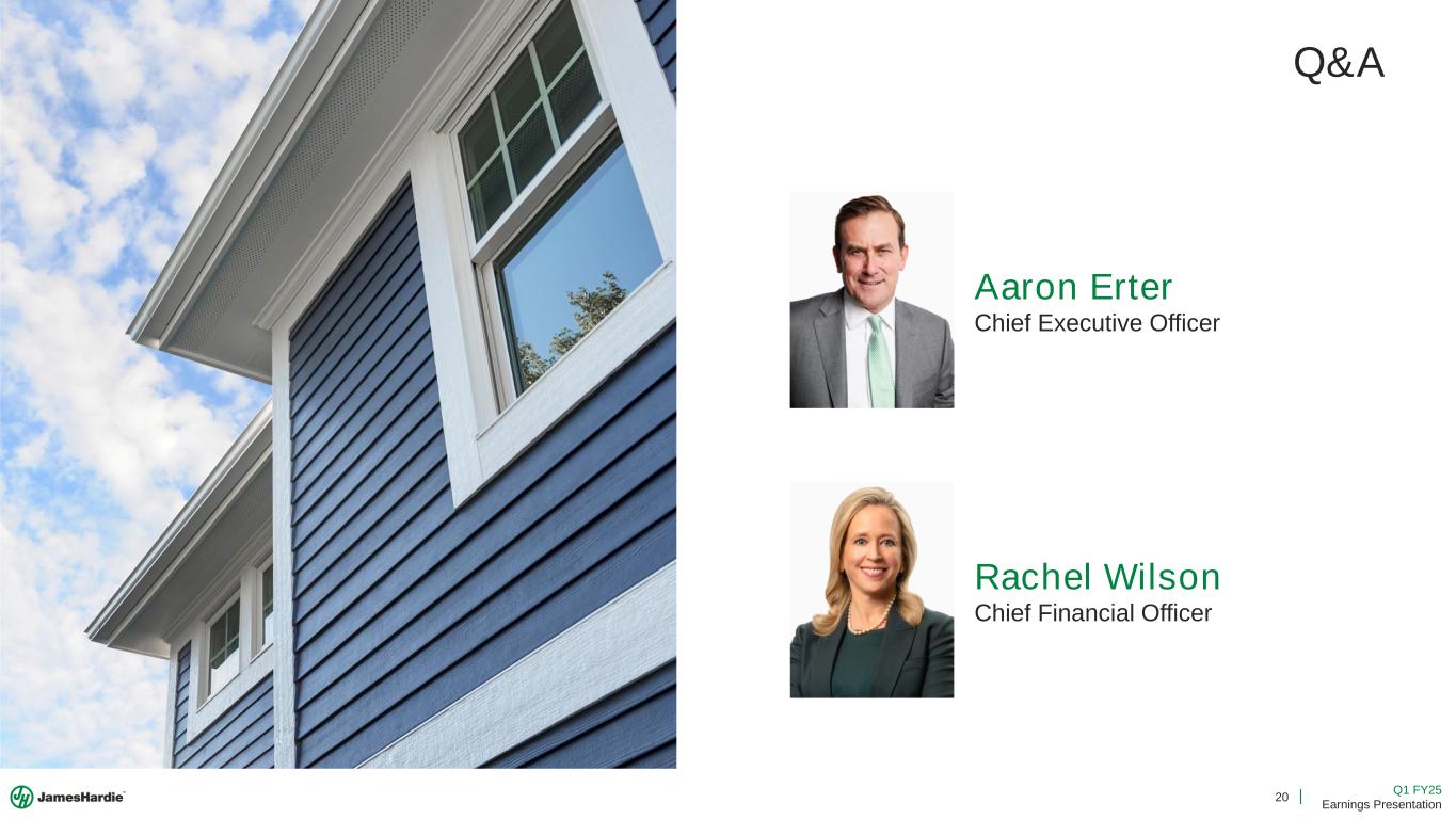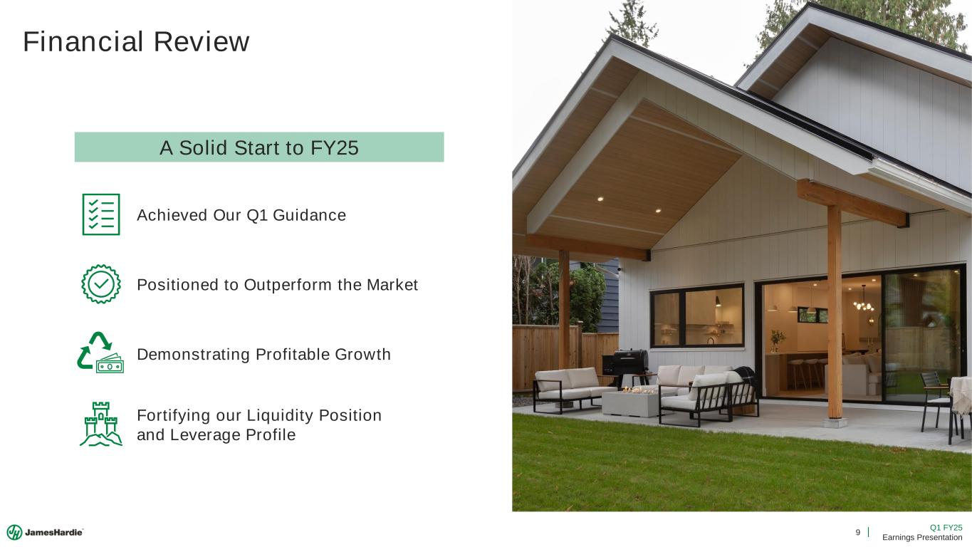 8 Q1 FY25 Earnings Presentation North America Long-Term Aspirations Note: “Homes with James Hardie” refers to the conceptual number of cumulative homes with Hardie® siding in North America based on total sales volumes and housing intensity of 2,600 sqft of siding per home. Double-Digit revenue growth Includes an assumption for low single-digit % market growth, +4pp of market outperformance from primary demand growth (PDG), and mid-single digit contribution from growth in average sale price per unit. References to increases in North America adjusted EBITDA and adjusted EBITDA margin expansion are vs. FY24. Increasing North America adjusted EBITDA by 3x incorporates management estimates for double-digit sales growth supported by capacity additions and underlying profitability improvements. Homes with James Hardie 0 5 10 15 20 25 2015 2020 2025 2030 2035 M ill io n s , C u m u la ti v e Deliver Long-Term Profitable Growth Aspire to Triple Our North America Adjusted EBITDA3x Double-Digit % Revenue Growth Over the Long-Term +DD% Significant Adjusted EBITDA Margin Expansion +500bps $ $ $ $$ High Incremental Returns On New Capacity