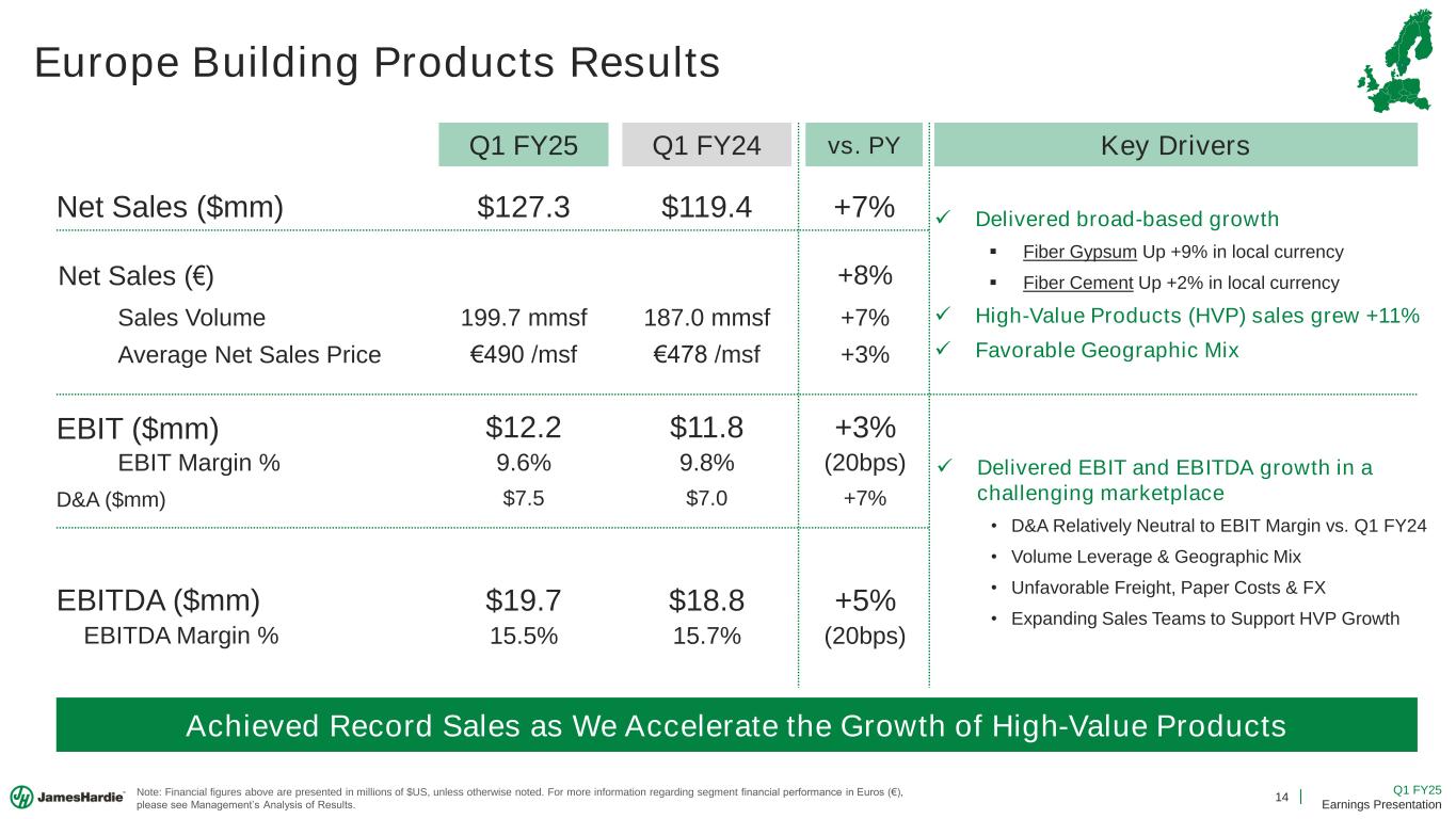 13 Q1 FY25 Earnings Presentation Asia Pacific Fiber Cement Results Net Sales ($mm) EBIT ($mm) EBITDA ($mm) EBITDA Margin % EBIT Margin % Average Net Sales Price Sales Volume Q1 FY25 Q1 FY24 vs. PY $135.3 $140.1 (3%) Leverage our Right to Win to Grow & Defend share 126.2 mmsf 138.4 mmsf (9%) A$1,457 /msf A$1,358 /msf +7% $41.2 $46.5 (11%) 30.4% 33.1% (270bps) Key Drivers $46.0 $50.6 (9%) 34.0% 36.1% (210bps) D&A ($mm) $4.8 $4.1 +17% Note: Financial figures above are presented in millions of US$, except for Average Net Sales Price, which is shown in A$/msf. For more information regarding segment financial performance in A$, please see Management’s nalysis of Results. Net Sales (A$) (2%) ✓ Favorable ASP ▪ Volume declines in Australia impacted by softer markets ✓ Focusing on what we can control to offset the impact of softer markets ▪ ~(50bps) Incremental D&A Impact to EBIT Margin ▪ Favorable Price and Product Mix ▪ Investing in the customer value chain ▪ Lower Volumes
