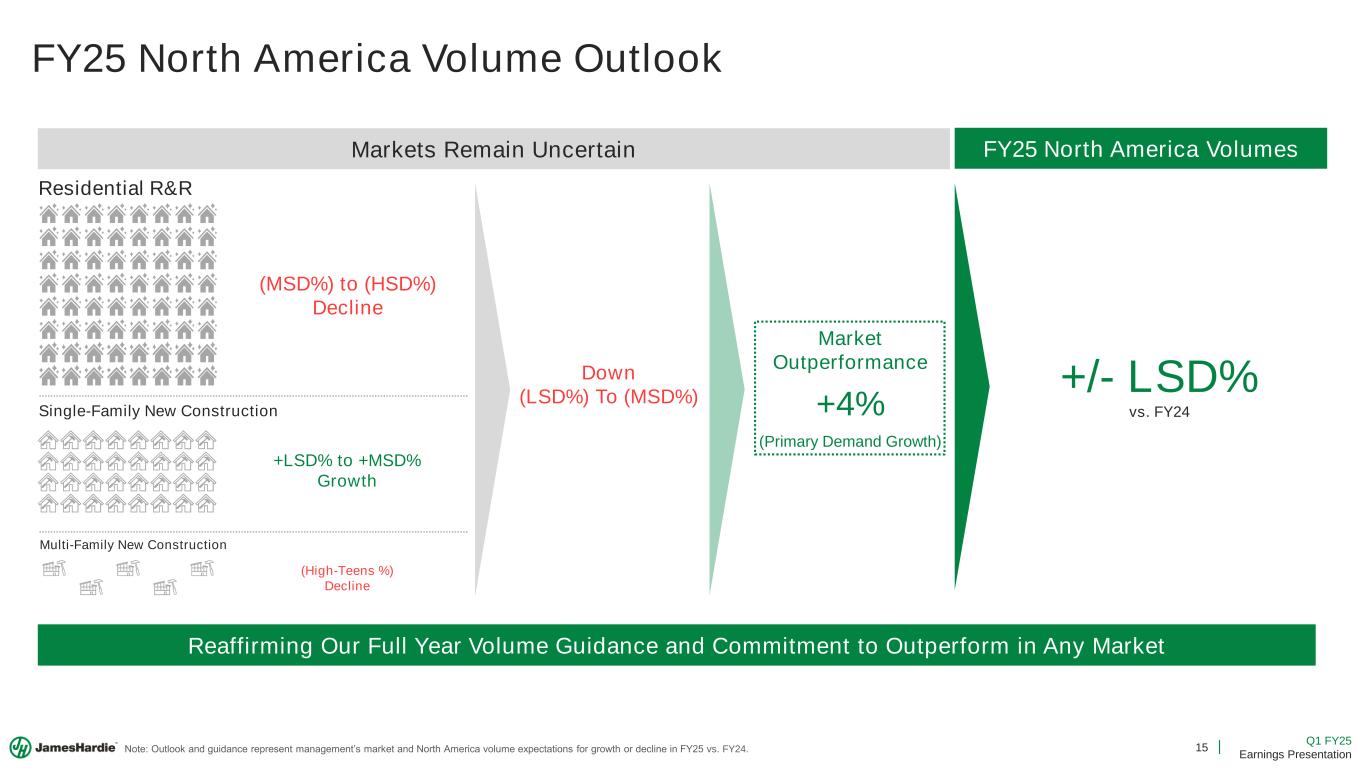 14 Q1 FY25 Earnings Presentation Europe Building Products Results Net Sales ($mm) EBIT ($mm) EBITDA ($mm) EBITDA Margin % EBIT Margin % Average Net Sales Price Sales Volume Q1 FY25 Q1 FY24 vs. PY $127.3 $119.4 +7% Achieved Record Sales as We Accelerate the Growth of High-Value Products 199.7 mmsf 187.0 mmsf +7% € /msf € 8 /msf +3% $12.2 $11.8 +3% 9.6% 9.8% (20bps) Key Drivers $19.7 $18.8 +5% 15.5% 15.7% (20bps) D&A ($mm) $7.5 $7.0 +7% Net Sales (€) +8% Note: Financial figures above are presented in millions of $US, unless otherwise noted. For more information regarding segment financial performance in uros (€), please see Management’s nalysis of Results. ✓ Delivered broad-based growth ▪ Fiber Gypsum Up +9% in local currency ▪ Fiber Cement Up +2% in local currency ✓ High-Value Products (HVP) sales grew +11% ✓ Favorable Geographic Mix ✓ Delivered EBIT and EBITDA growth in a challenging marketplace • D&A Relatively Neutral to EBIT Margin vs. Q1 FY24 • Volume Leverage & Geographic Mix • Unfavorable Freight, Paper Costs & FX • Expanding Sales Teams to Support HVP Growth
